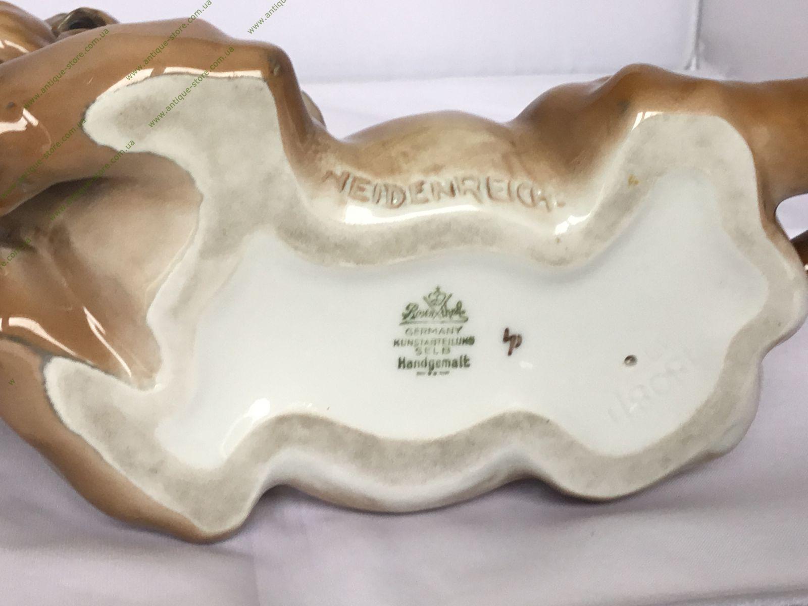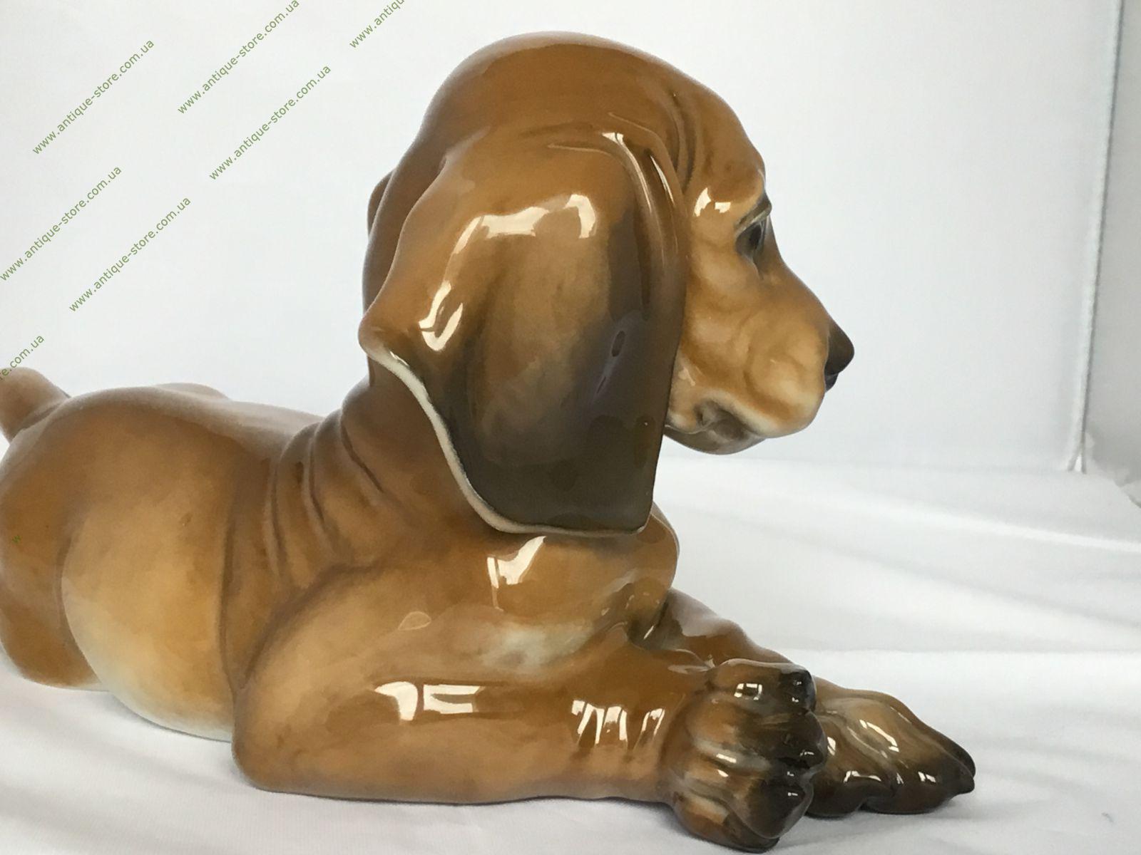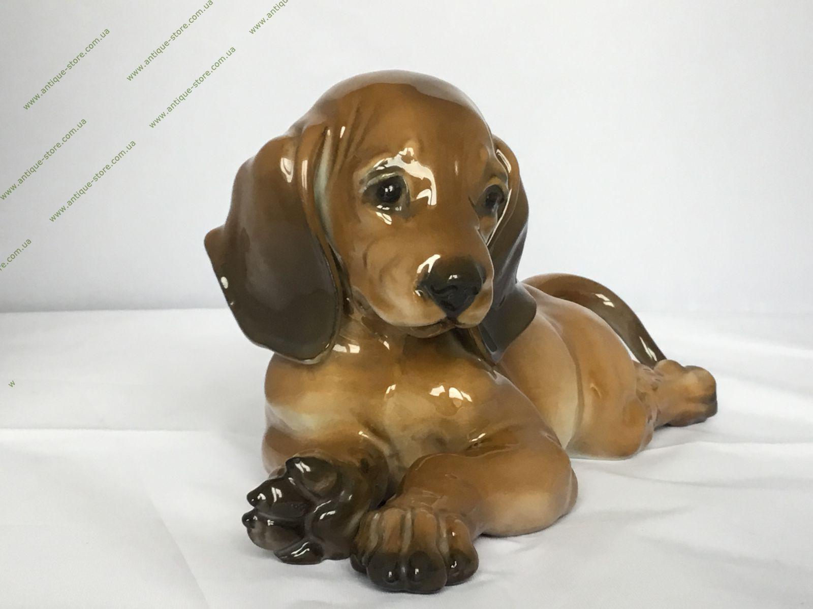 Фарфоровая фигурка лежащего щенка таксы. Работа знаменитого художника фабрик Розенталь (Rosenthal) Фрица Хайденрейха (Fritz Heidenreich). Снизу зеленое подглазурное клеймо «Rosenthal handgemalt». Номер в тесте 1808/1, клеймо мастера.