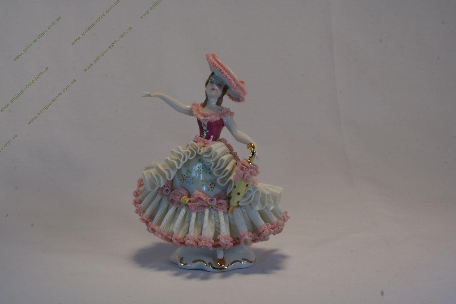 Коллекционная фарфоровая статуэтка "Дама в шляпе и с зонтиком", изготовлена из знаменитого кружевного дрезденского фарфора (Dresden), Германия.