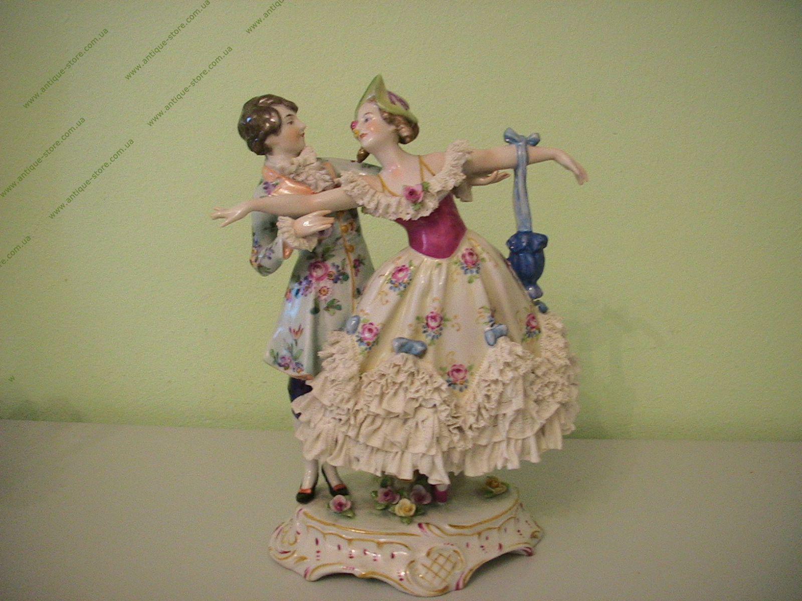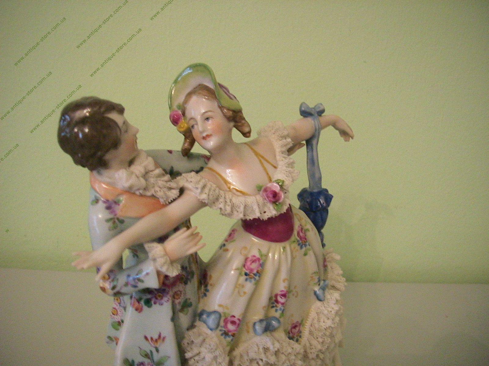 Фарфоровая композиция, изображающая танцующую, влюбленную пару: кавалера и даму. Фигурка знаменитой фарфоровой мануфактуры Рудольштат (Rudolstadt), саксоннский фарфор, Германия.