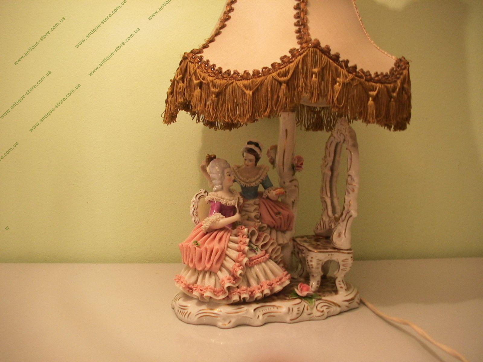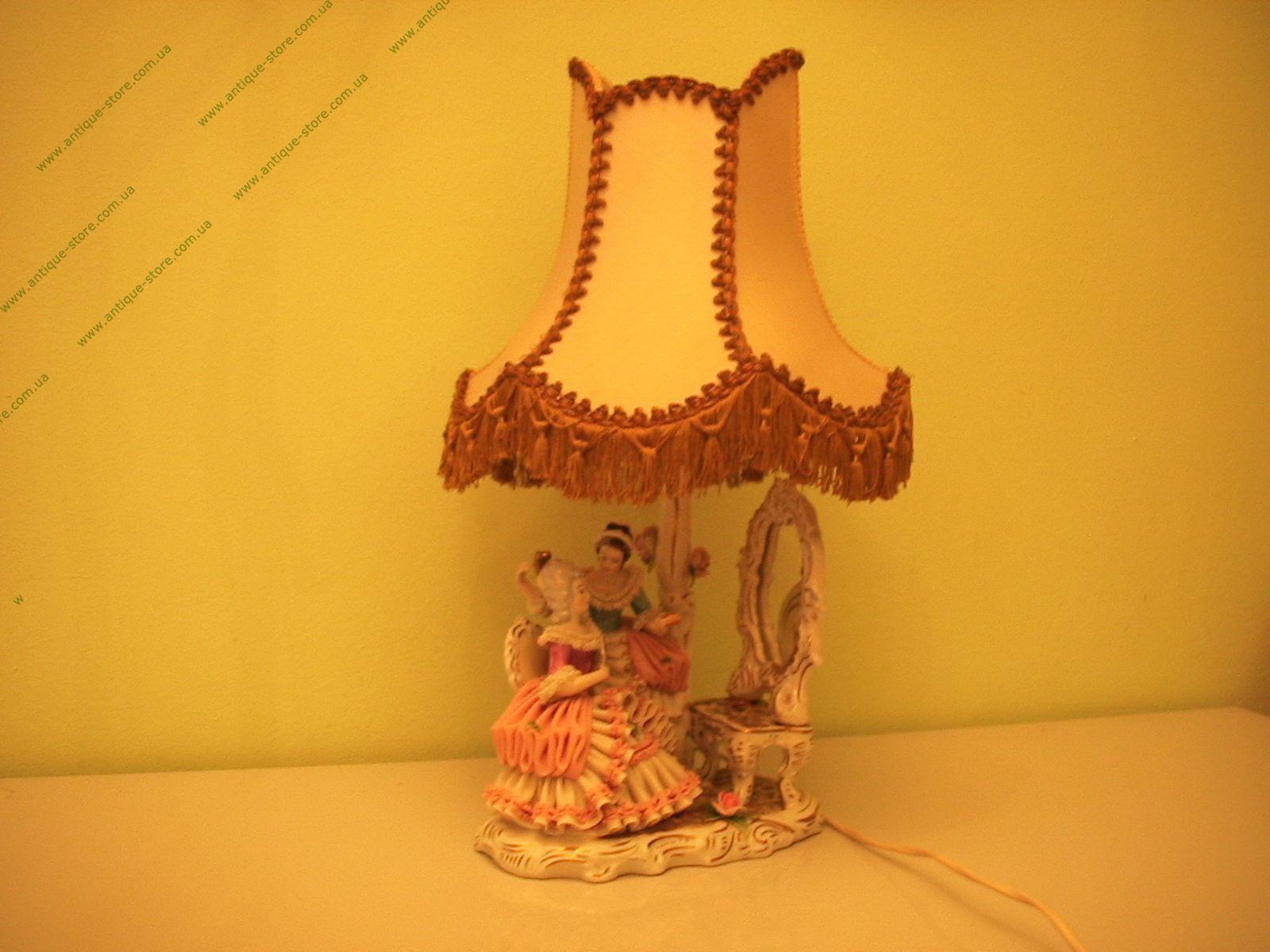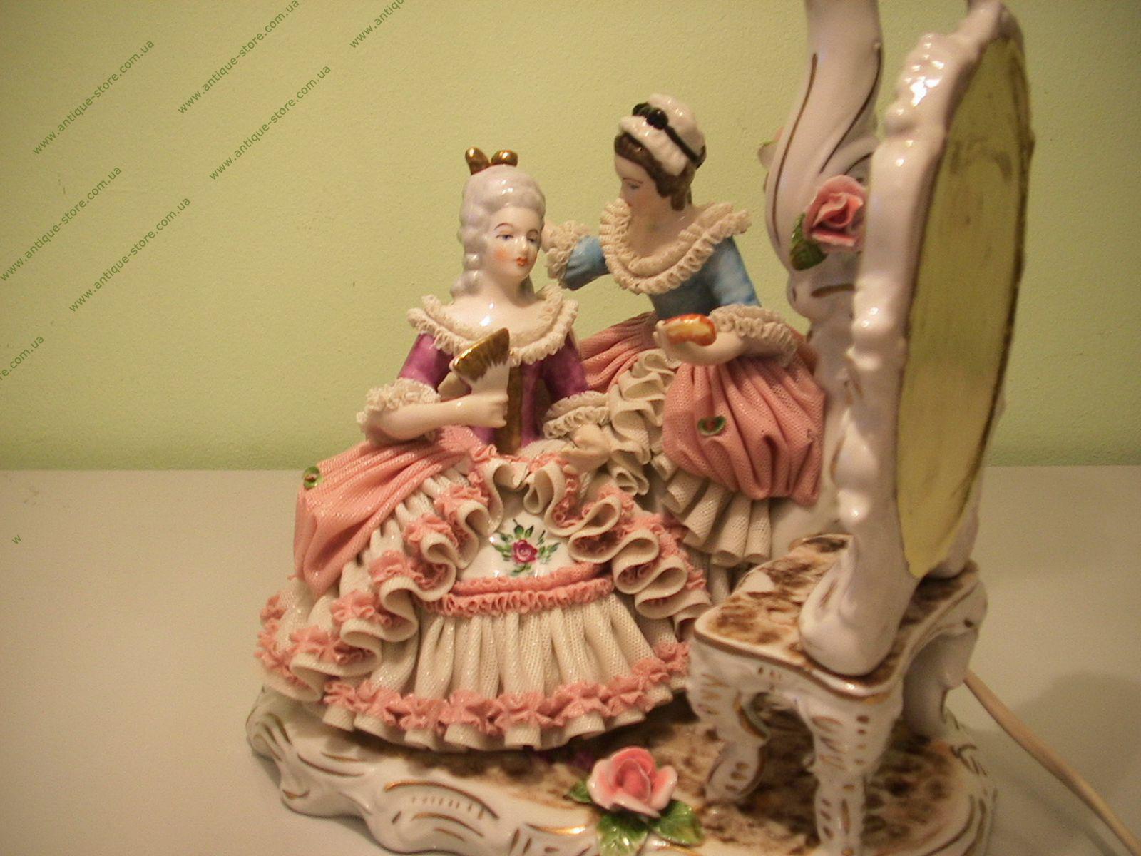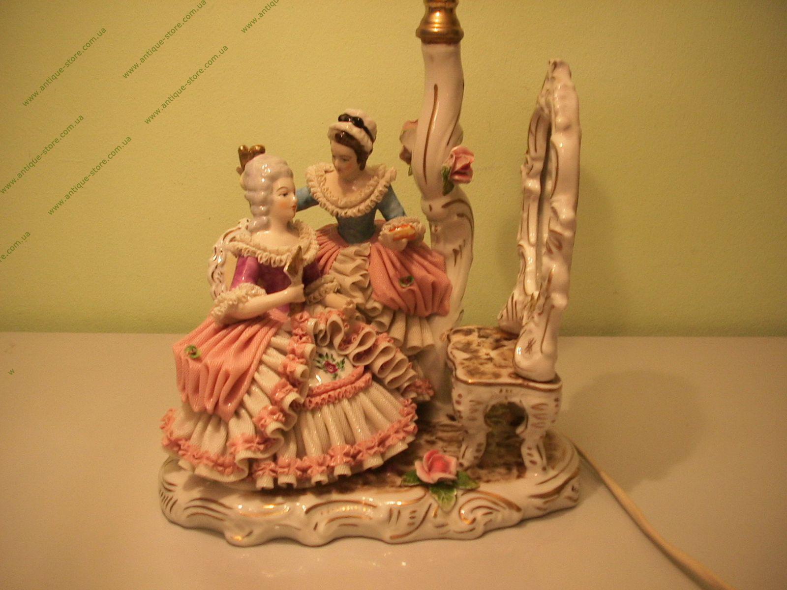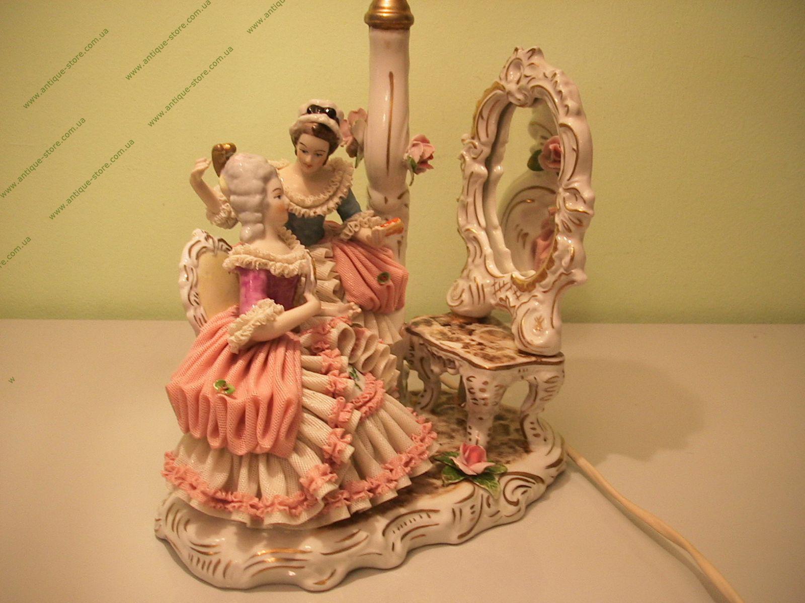 Великолепная настольная лампа из цветного кружевного фарфора, изображающая даму с веером, сидящую перед зеркалом. Рядом с ней стоит горничная, помогает госпоже подготовиться к балу. Дамы одеты в роскошные платья. Лампа украшена старинным абажуром. Технически исправна, в хорошем состоянии. Производства знаменитой немецкой фабрики фарфора Купс В. Ритих (Kups W.Rittirsch Porzellan), Бавария.