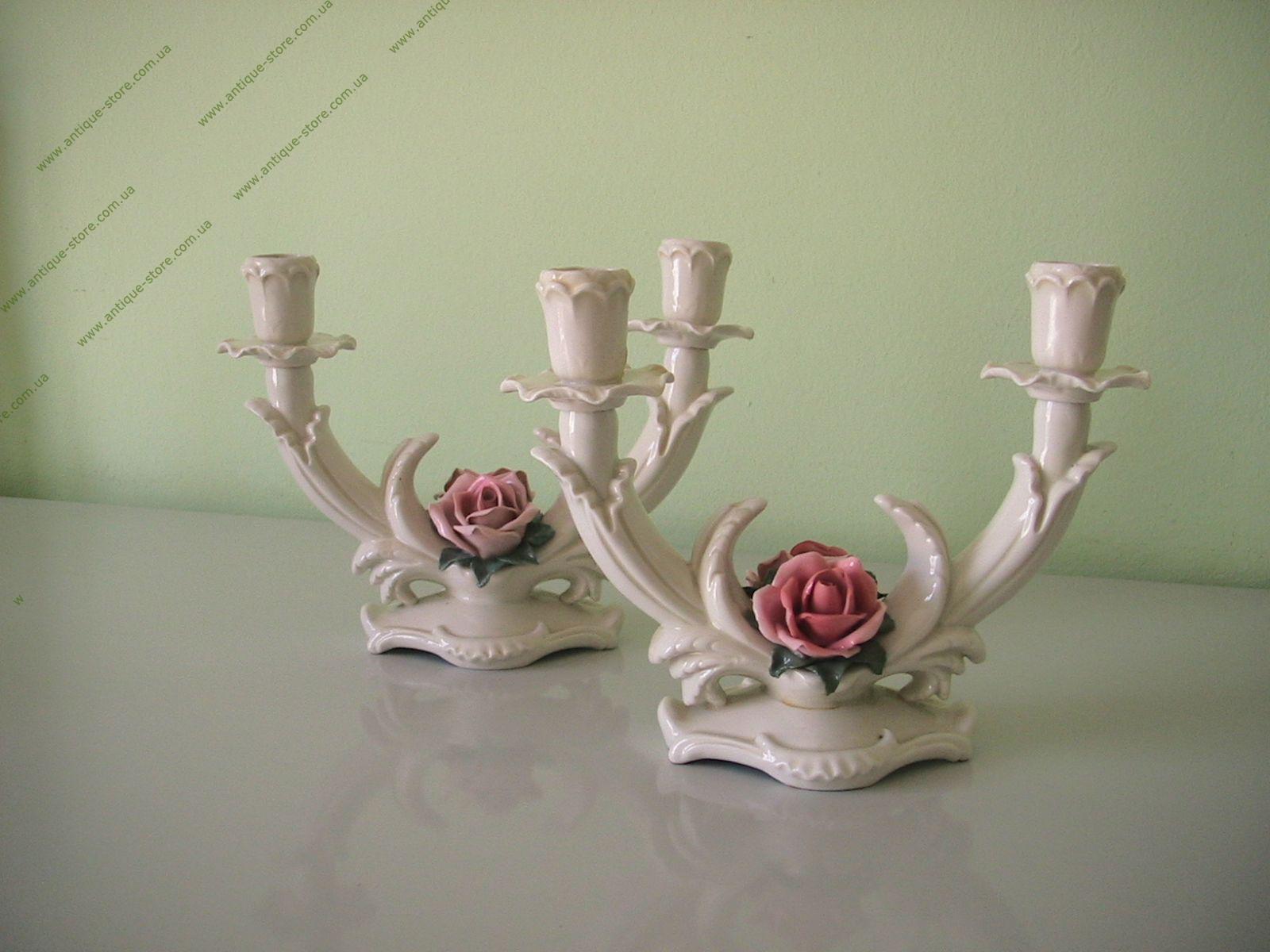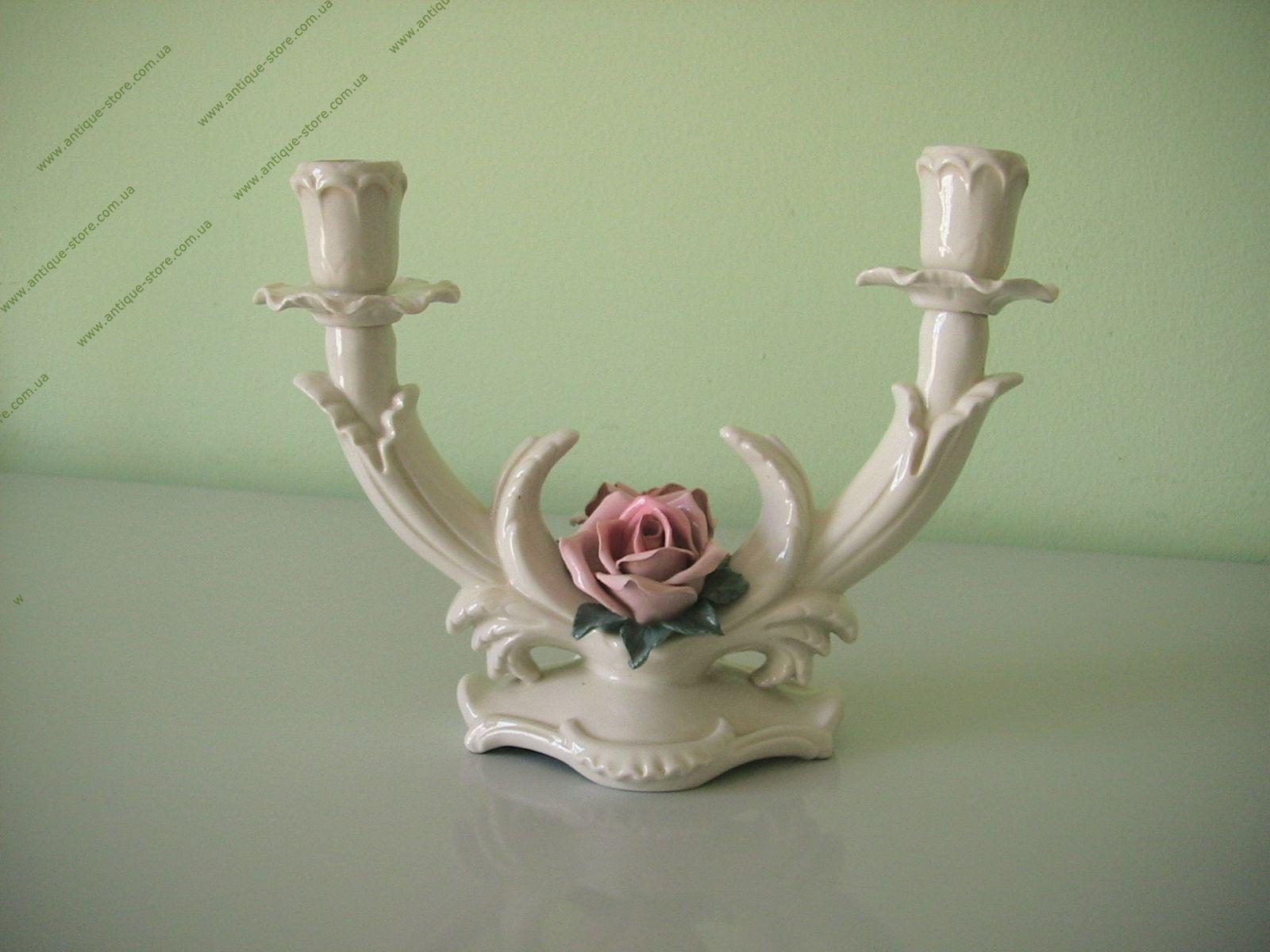 Старинный подсвечник из глазурованного фарфора известной немецкой мануфактуры Karl Ens (Thüringen). На обратной стороне подсвечника маркировка: синее подглазурное клеймо ENZ. Подсвечник украшен нежным букетом из роз.
