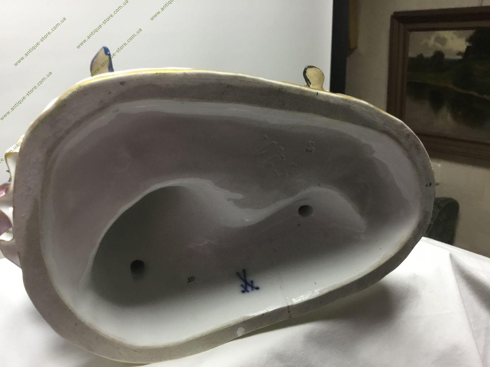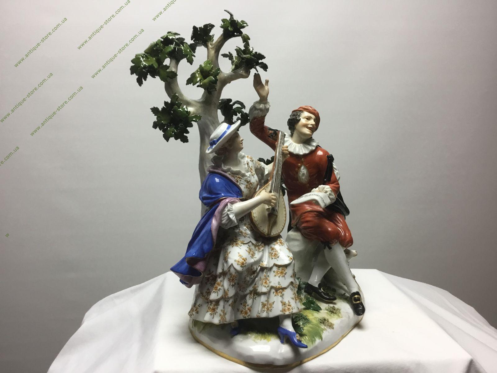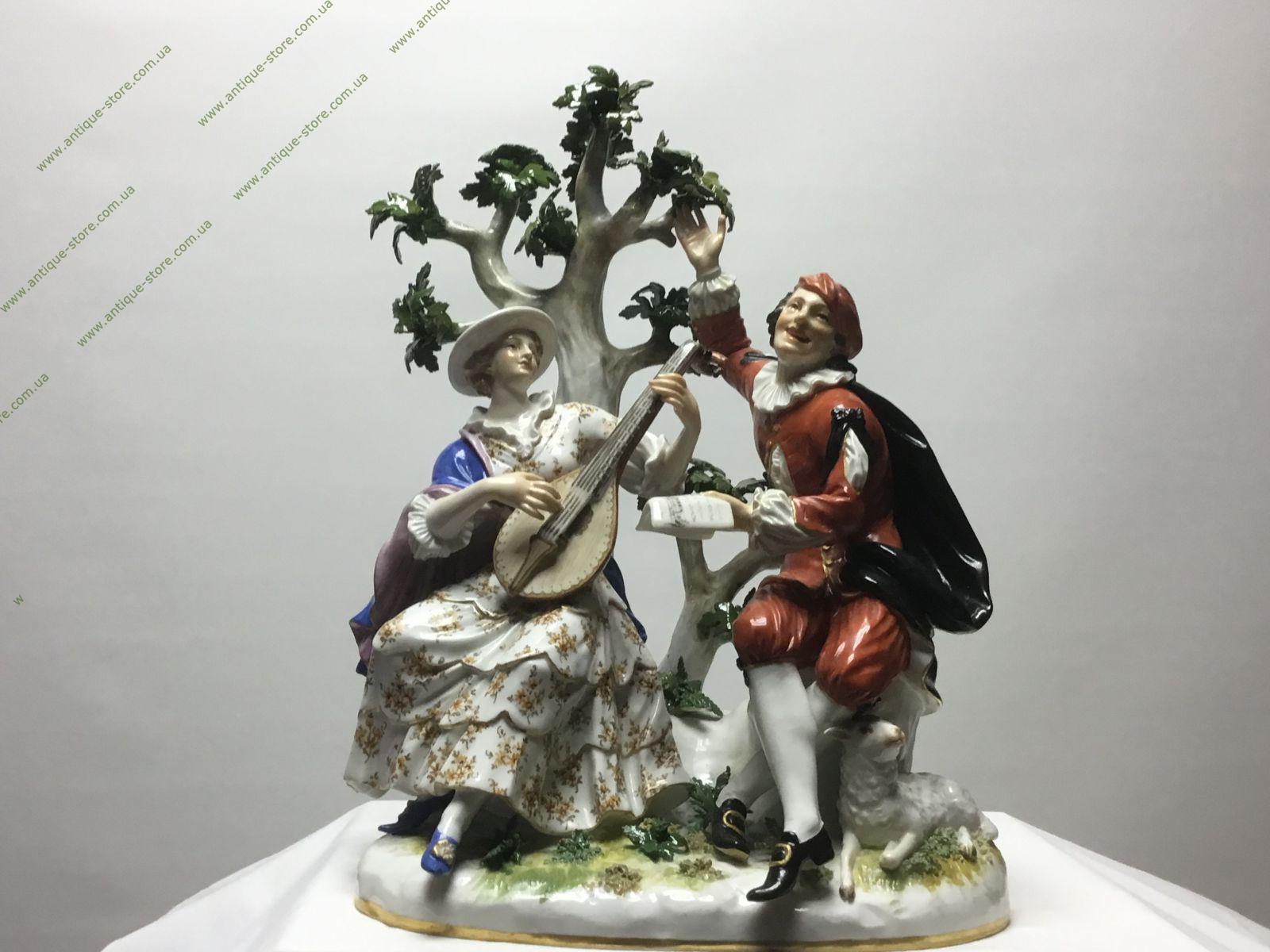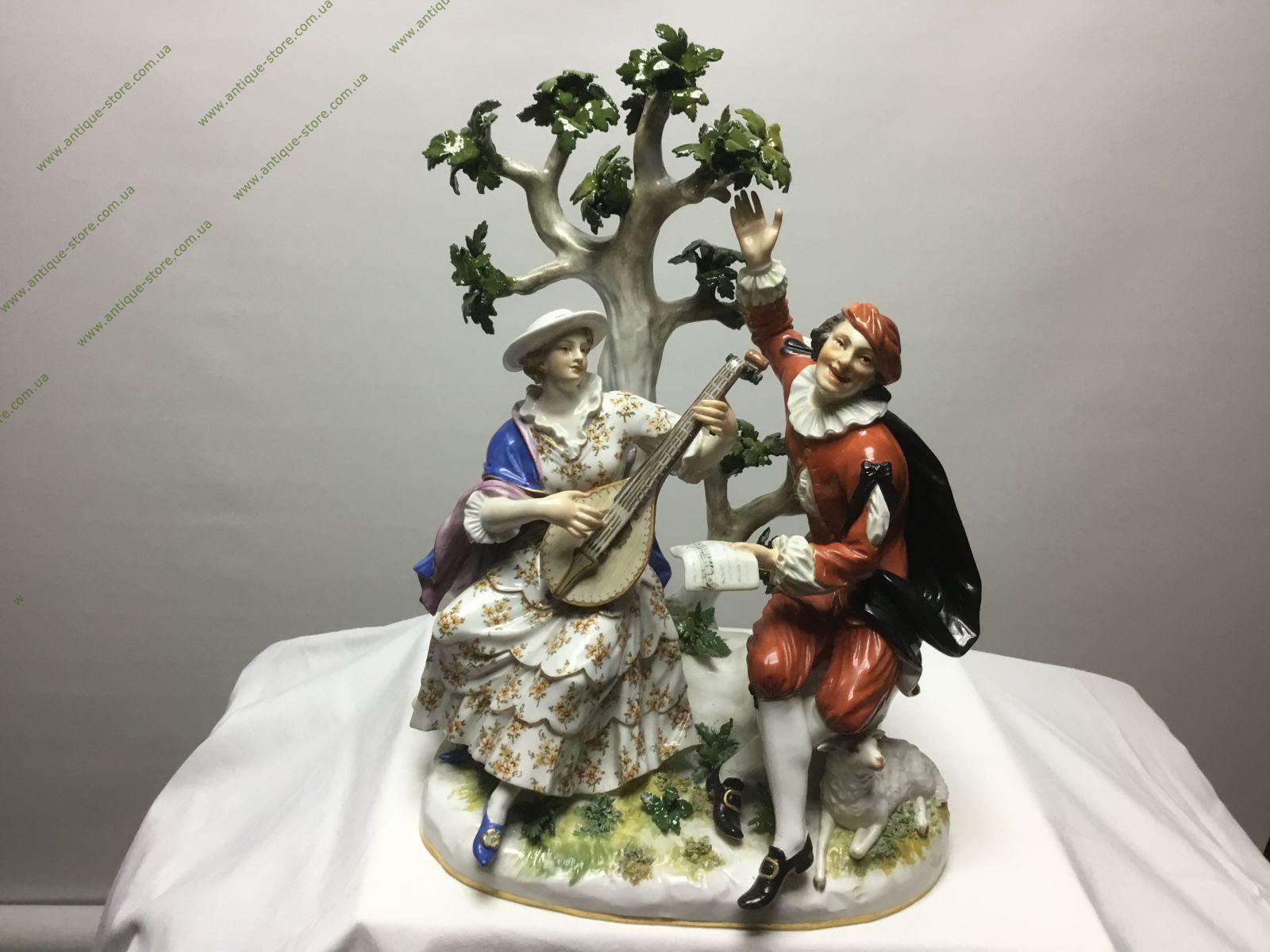 Редкая фигура мануфактуры Мейсен, изображающая персонажей итальянской комедии масок (комедии дель арте) Скарамуша и Коломбину, поющими под деревом. Год модели 1744, модель-№ 520 (61027)