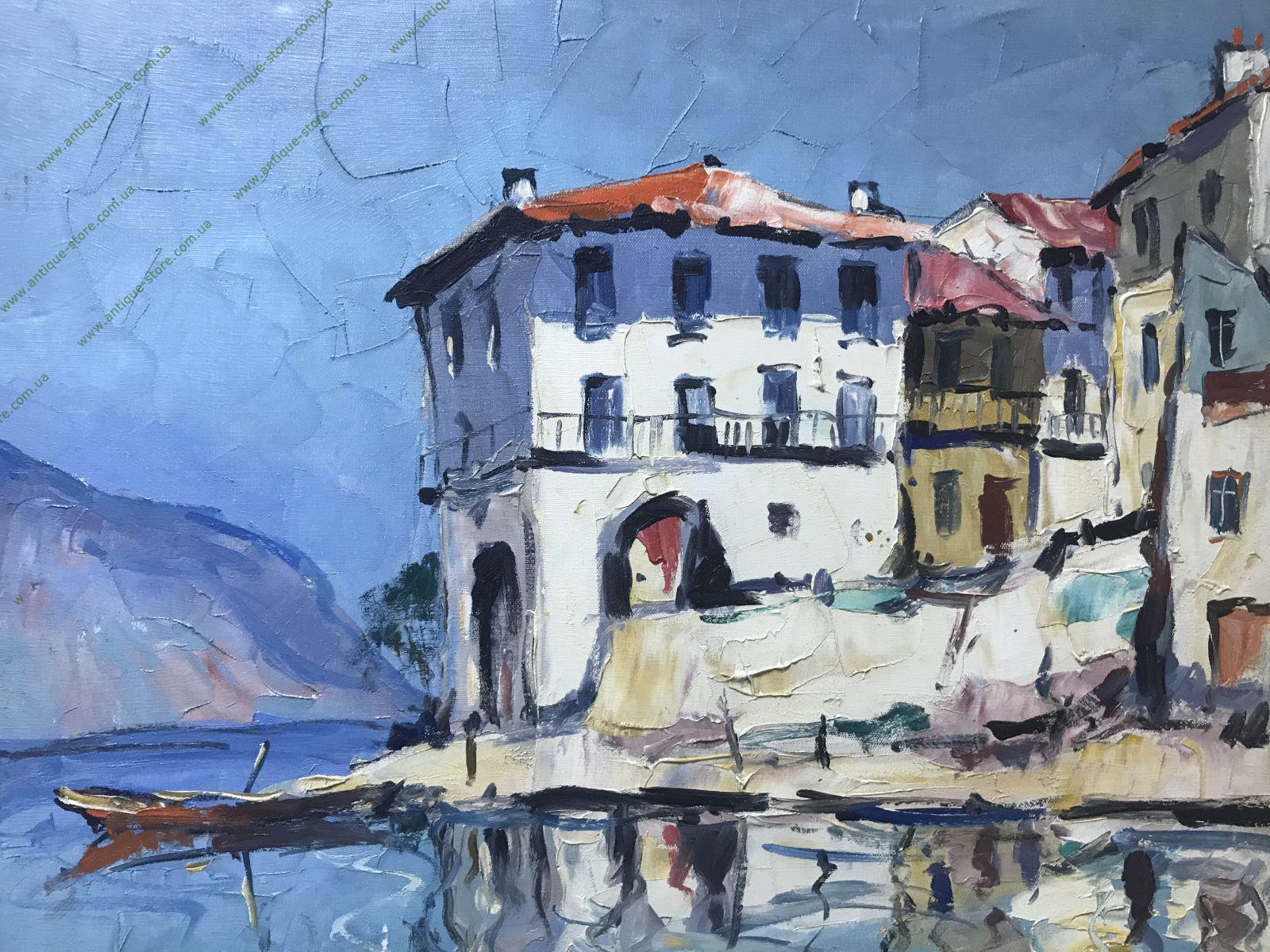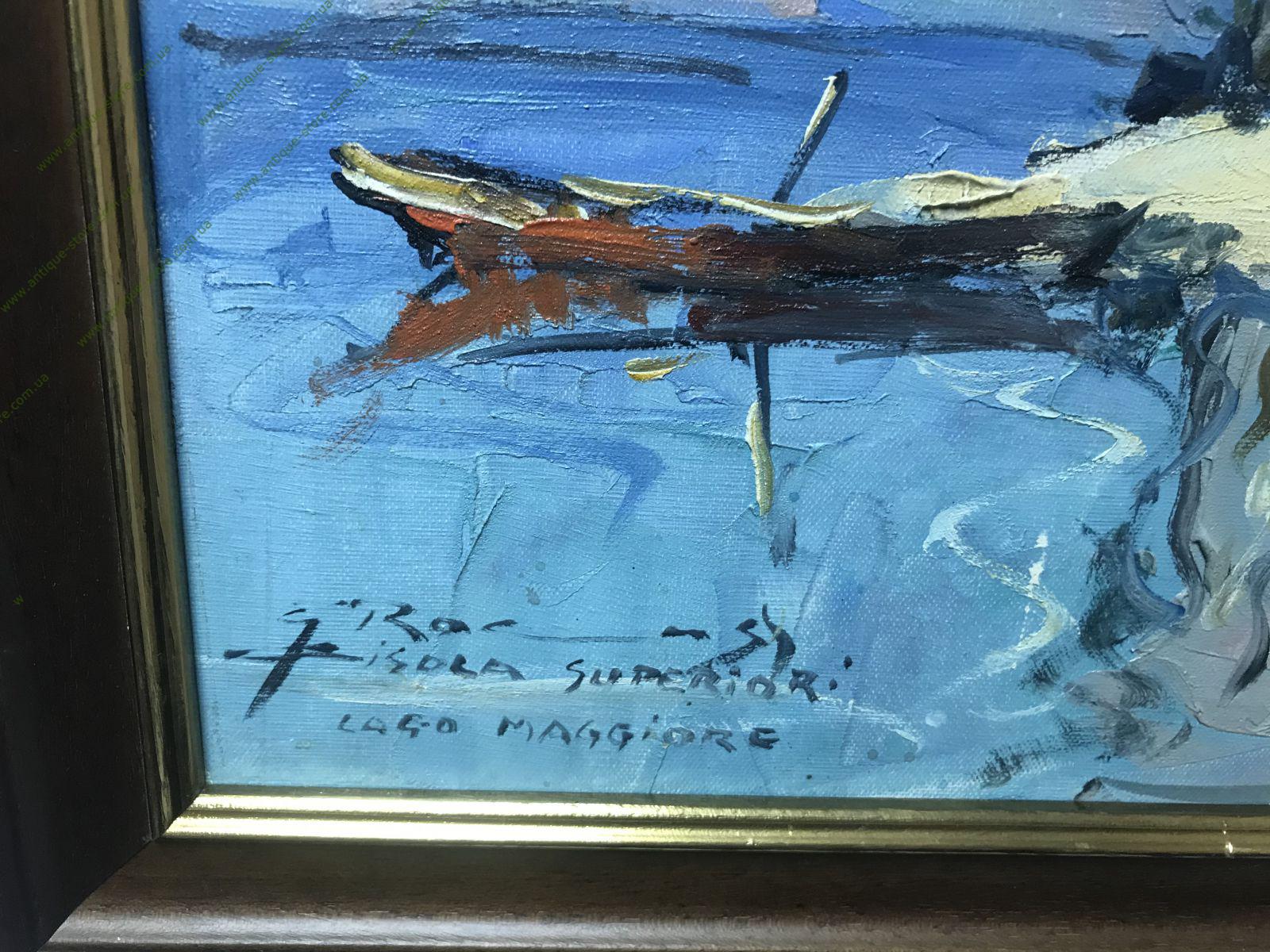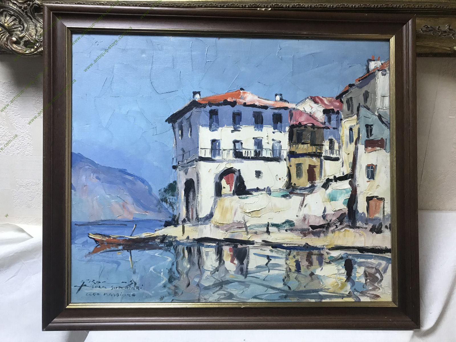 Вилла на берегу озера Лаго Маджоре. Картина в стиле импрессионизм, изображающая итальянский городок на берегу озера Лаго Маджоре. Справа внизу подпись Lago Maggiore , Isola Superiore. Картина в багетной раме.