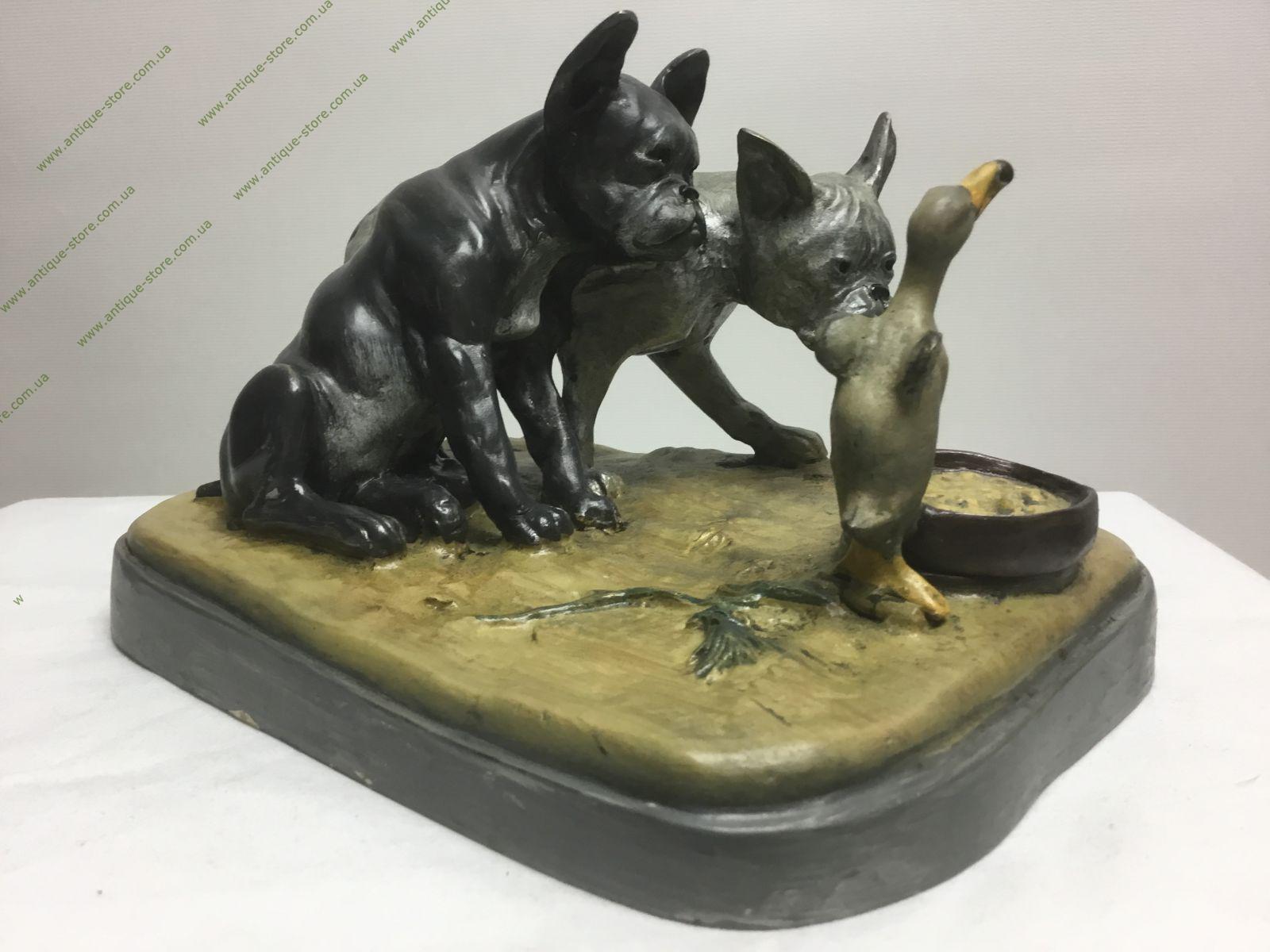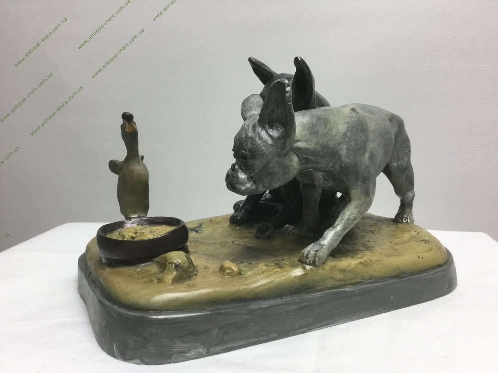 Статуэтка выполнена с любовью и юмором, характерными для работ из венской бронзы. Маленький утёнок широко открыл клюв на миску для двух бульдогов. Статуэтка — чернильница. Клеймо "Литера В в кувшине". Фабрика Бергмана.