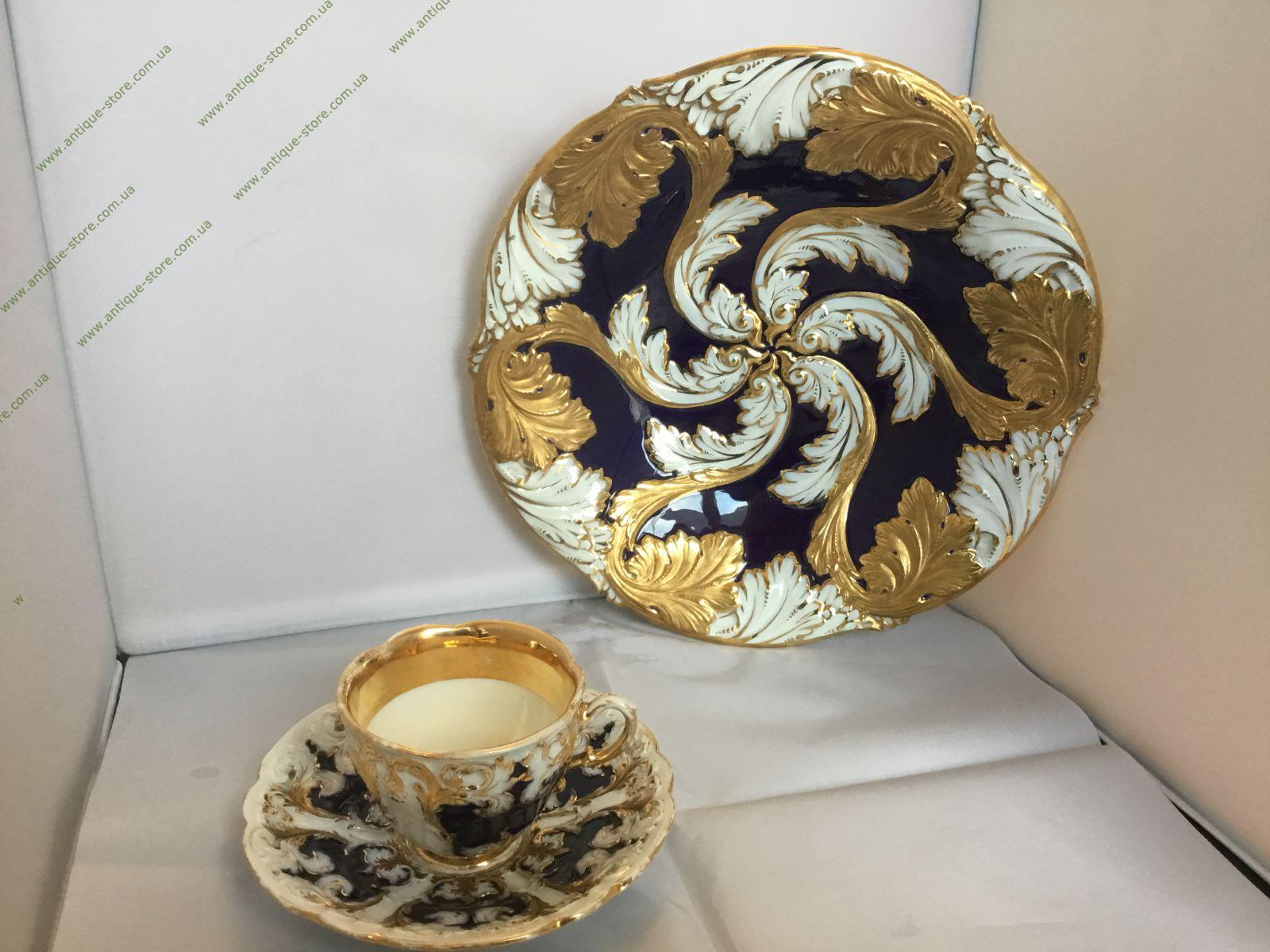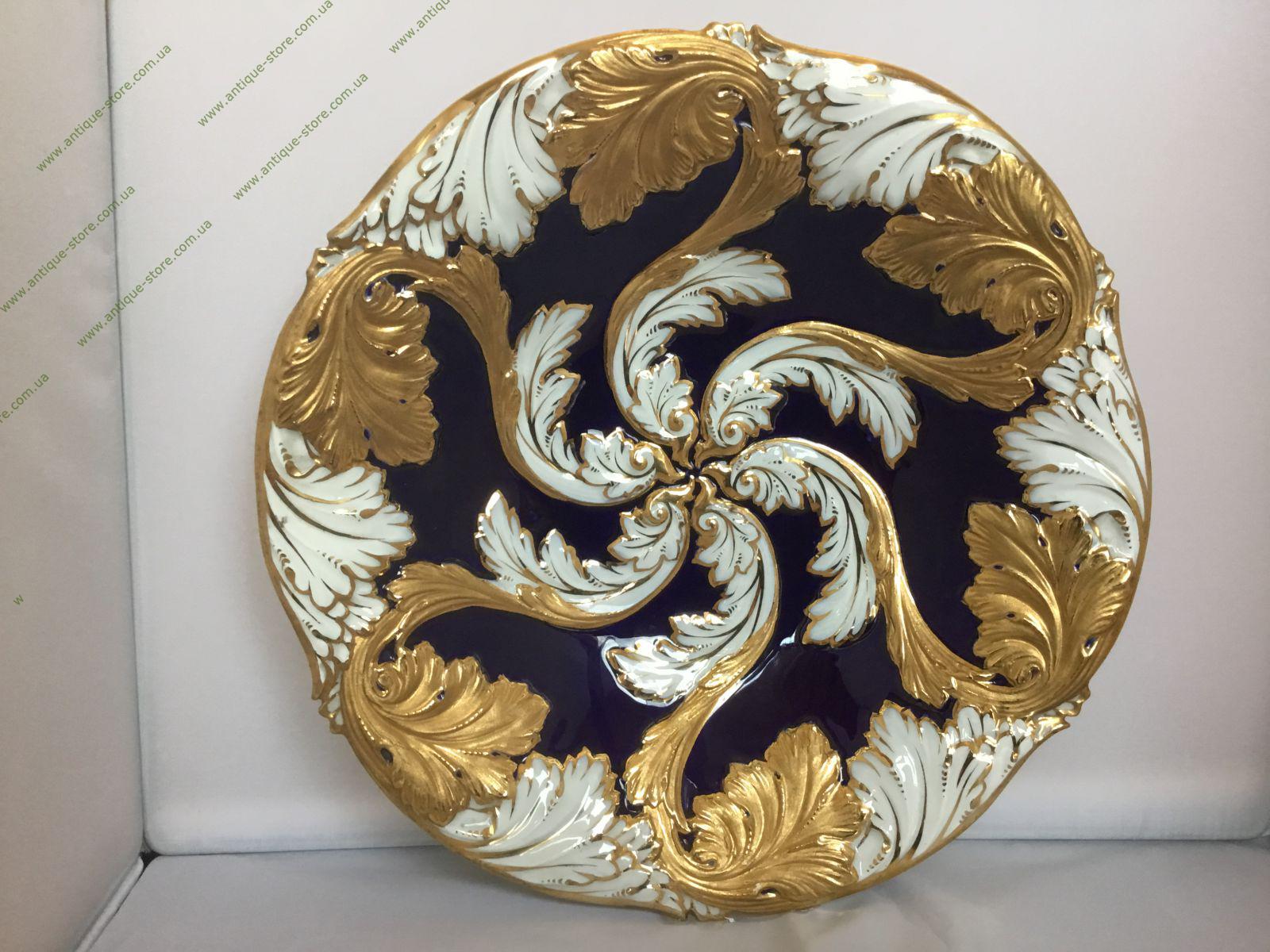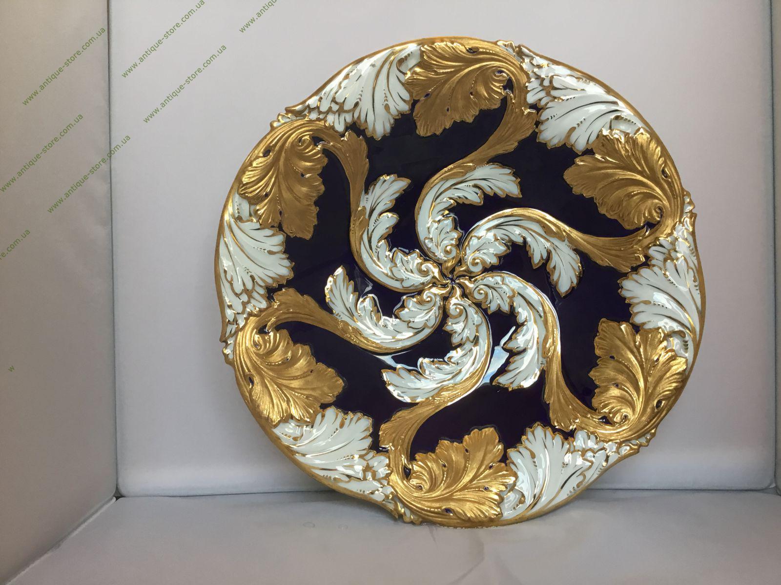 Великолепная редкая парадная тарелка мануфактуры Мейсен, выполненная в стиле рококо. 20-й век, клеймо — перекрещенные мечи, 63, N G109, 4-6 , Растительный декор. Кобальт, золочение. Германия.