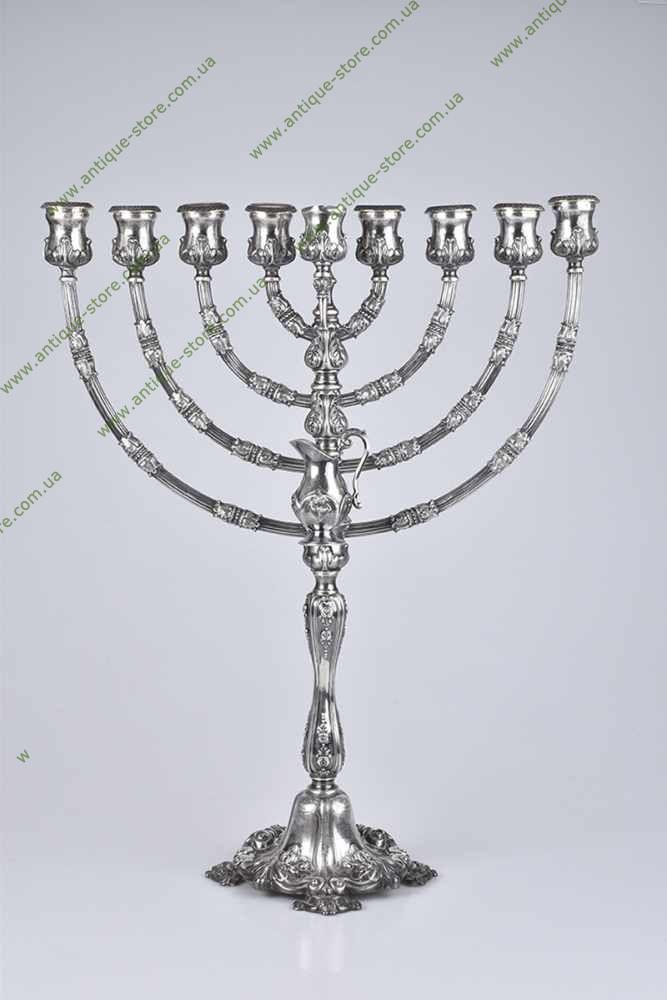 Ханукальная менора (девятисвечник), ханукия, стерлинговое серебро 925°, фигурная форма, ручная работа, с 8 светильниками и одним съемным светильником (шамаш) по центру, а также съемным кувшином для масла. Клеймо 925° и штемпель «Topazio», Вес 2500 гр. Португалия.