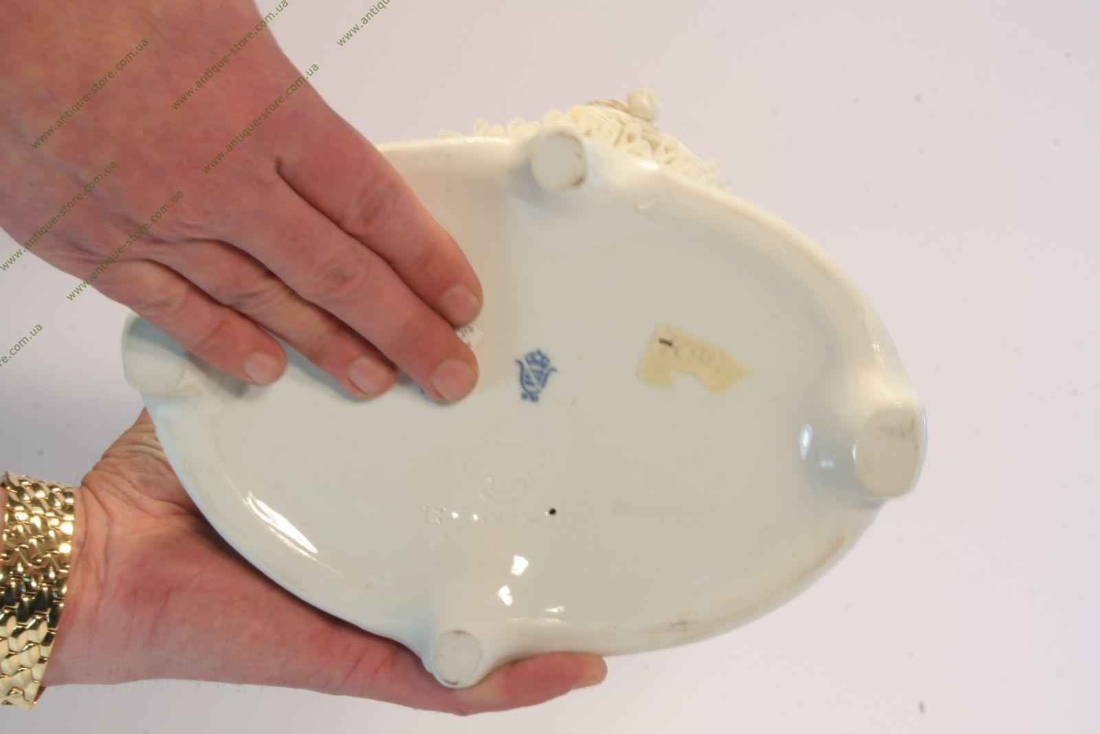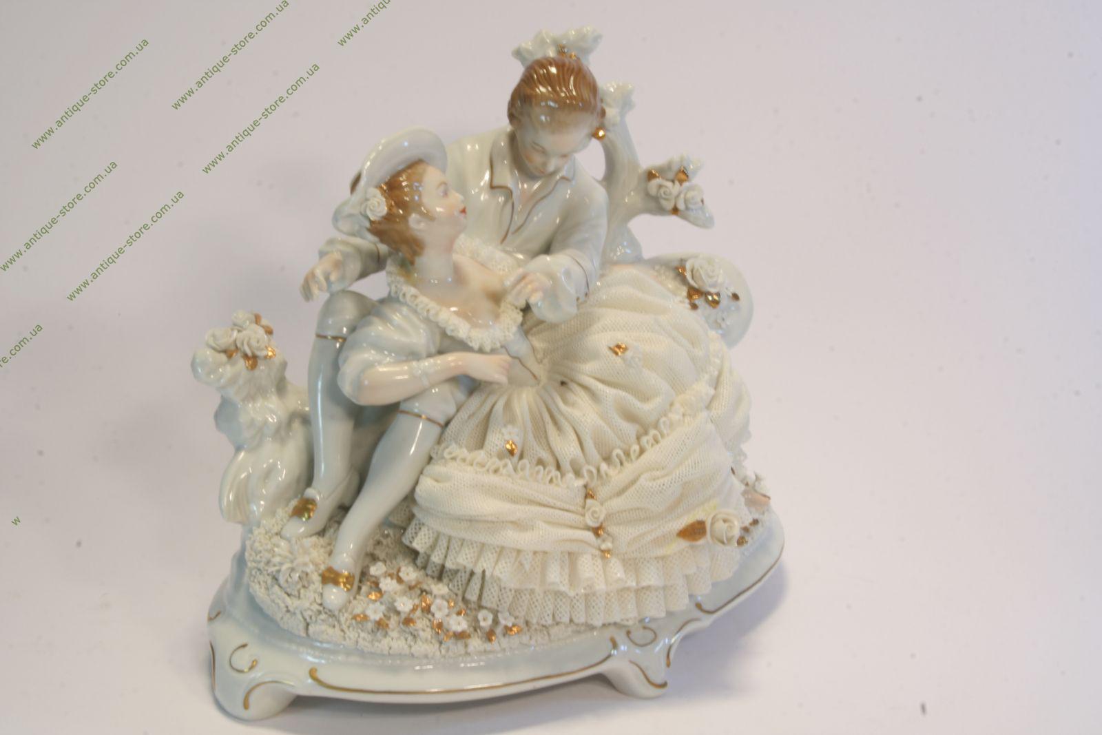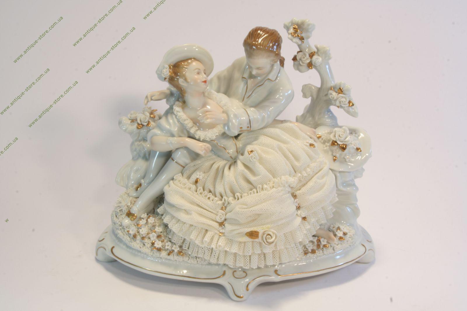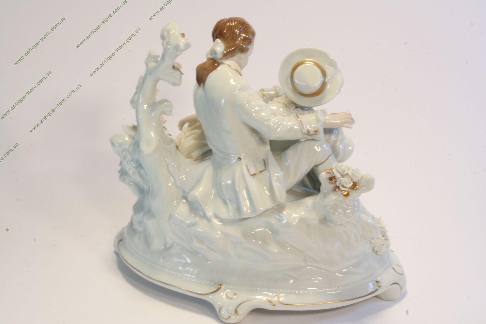 Фарфоровая фигура галантной пары - кавалера и дамы, сидящих на лужайке среди цветов, под деревом. Фигура выполнена из тончайшего кружевного фарфора, немецкая фарфоровая мануфактура Аэльтесте Фольксштедт (Aelteste Volkstedt).