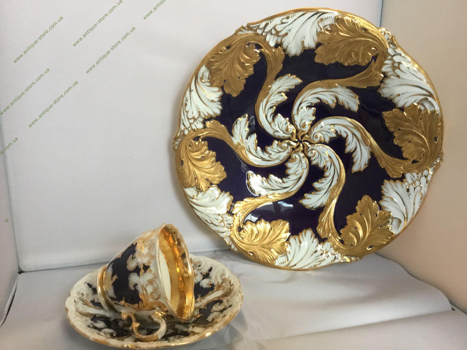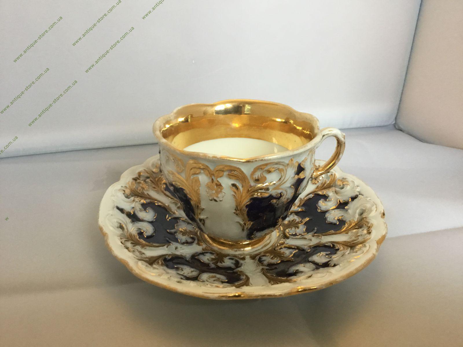 Чашка с блюдцем мануфактуры Мейсен, выполнены в стиле рококо. 20-й век, клеймо — перекрещенные мечи, 11, Растительный декор. Кобальт, золочение. Следы времени и использования. Без сколов и трещин. Германия.