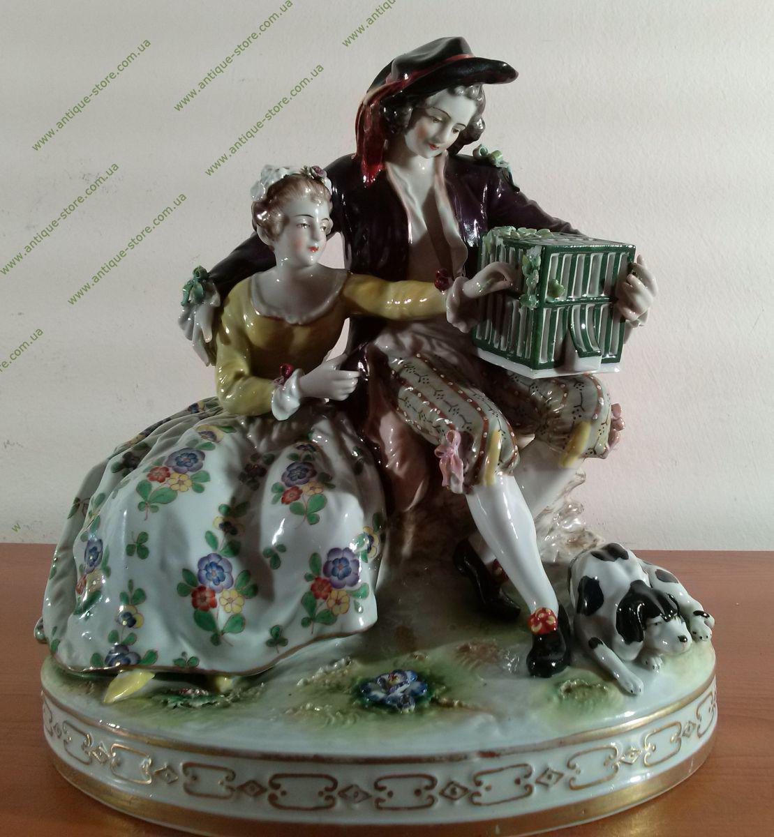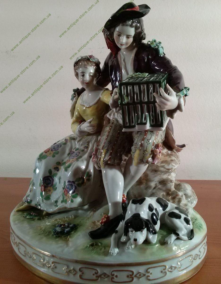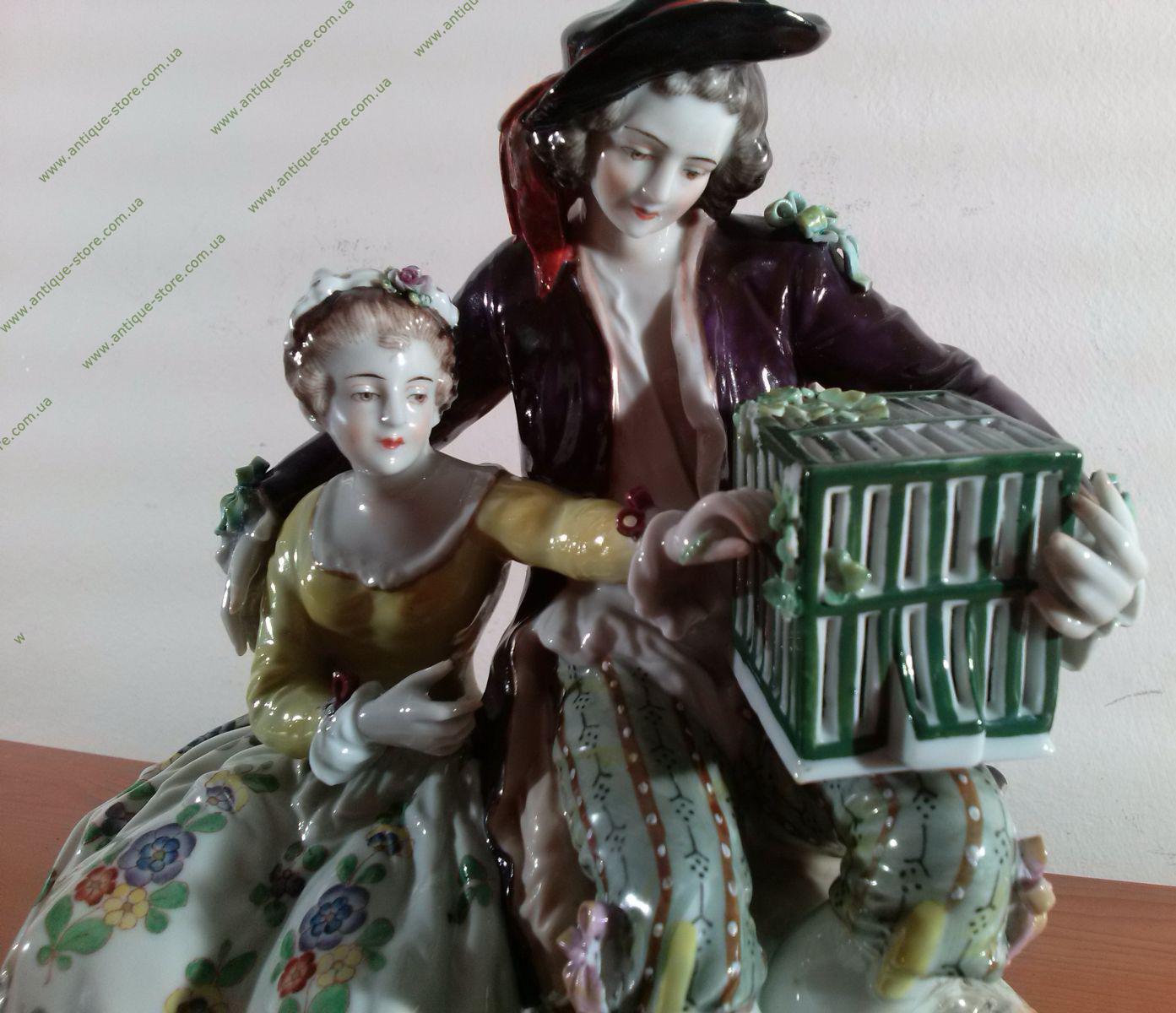 Фарфоровая композиция, изображающая галантную сцену: кавалера и даму, с клеткой для птицы и собакой, немецкая фарфоровая мануфактура Альтесте Фольксштедт (Aelteste Volkstedt)