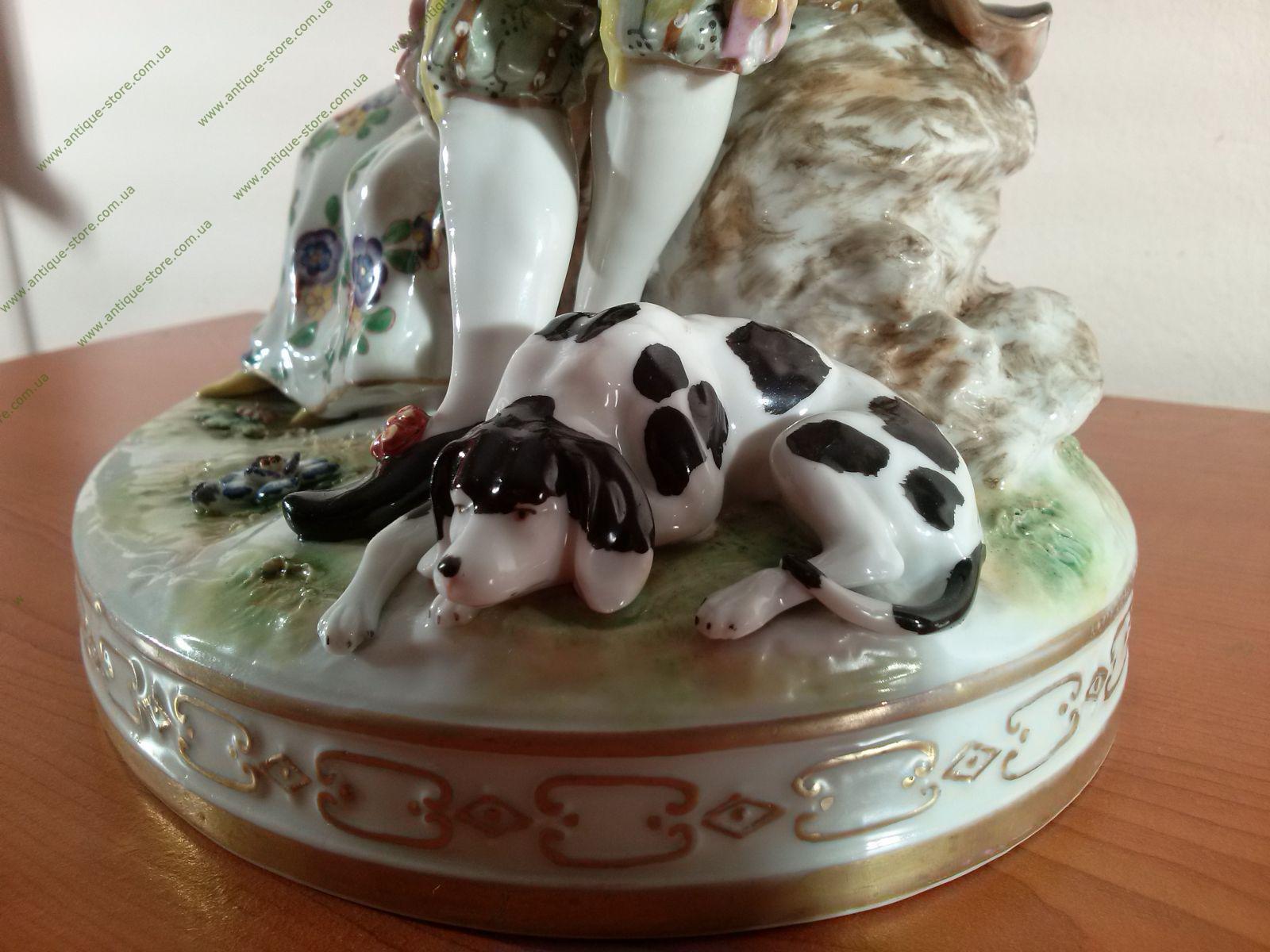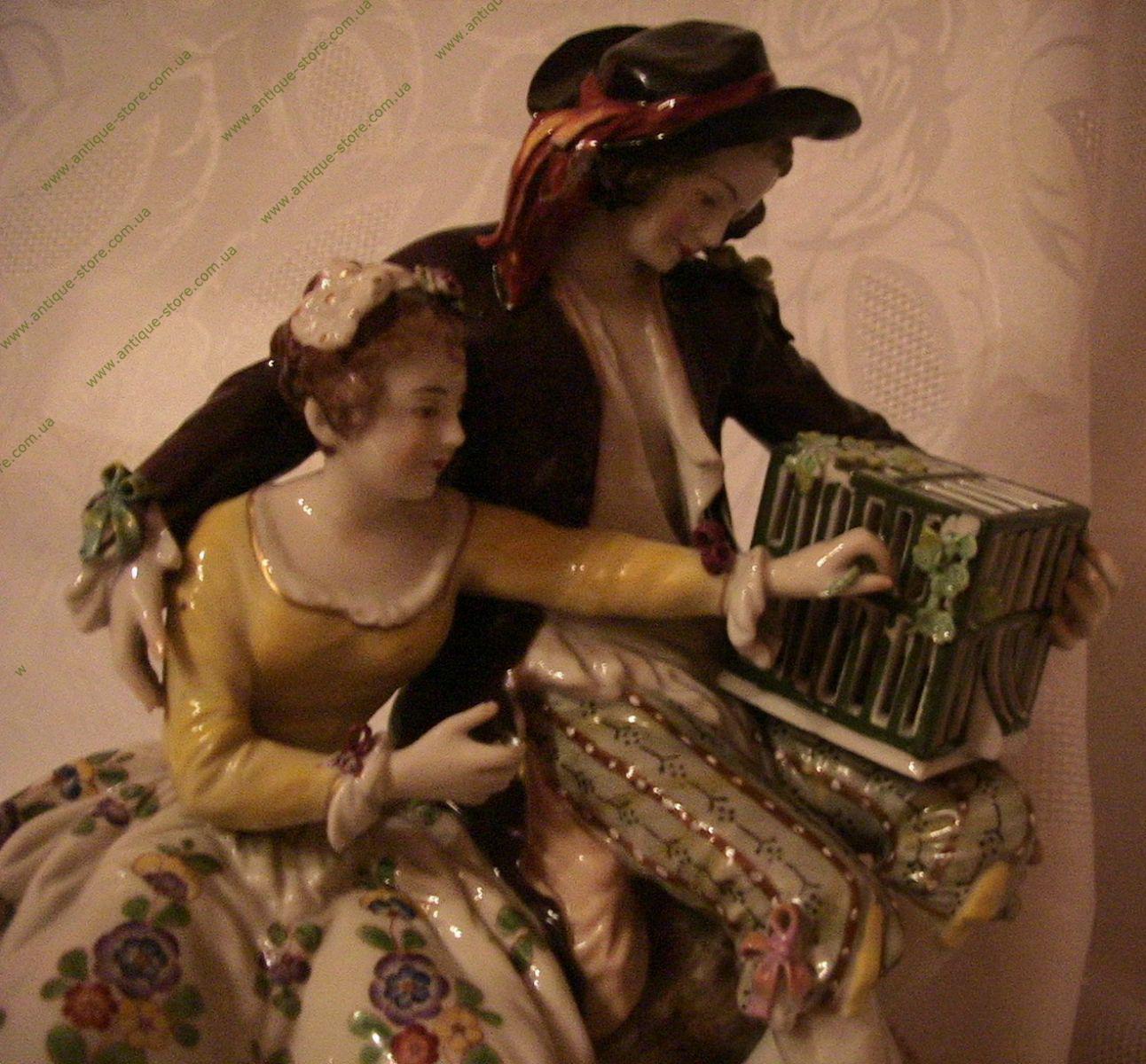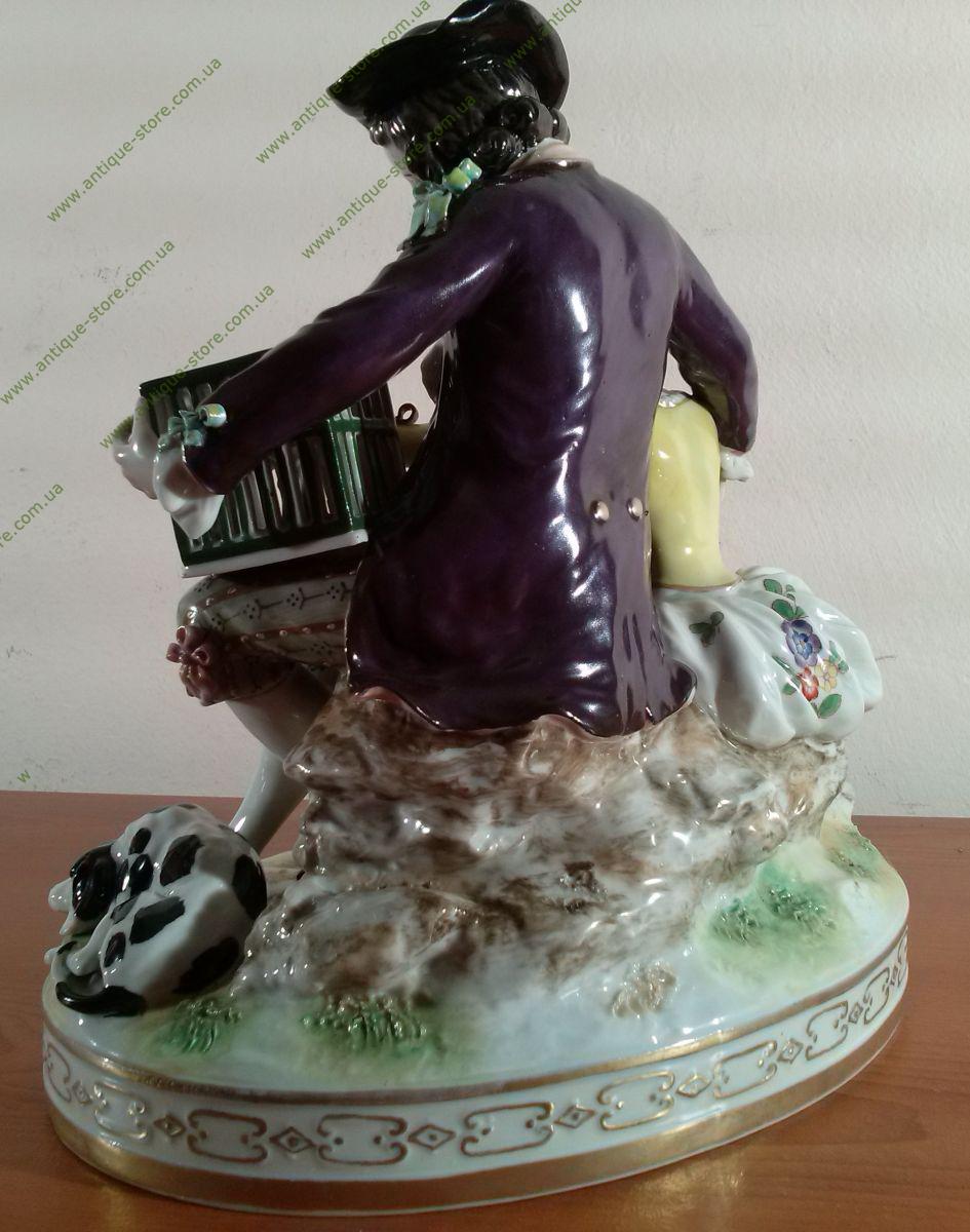 Фарфоровая композиция, изображающая галантную сцену: кавалера и даму, с клеткой для птицы и собакой, немецкая фарфоровая мануфактура Альтесте Фольксштедт (Aelteste Volkstedt)
