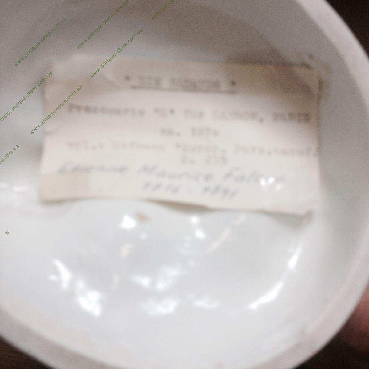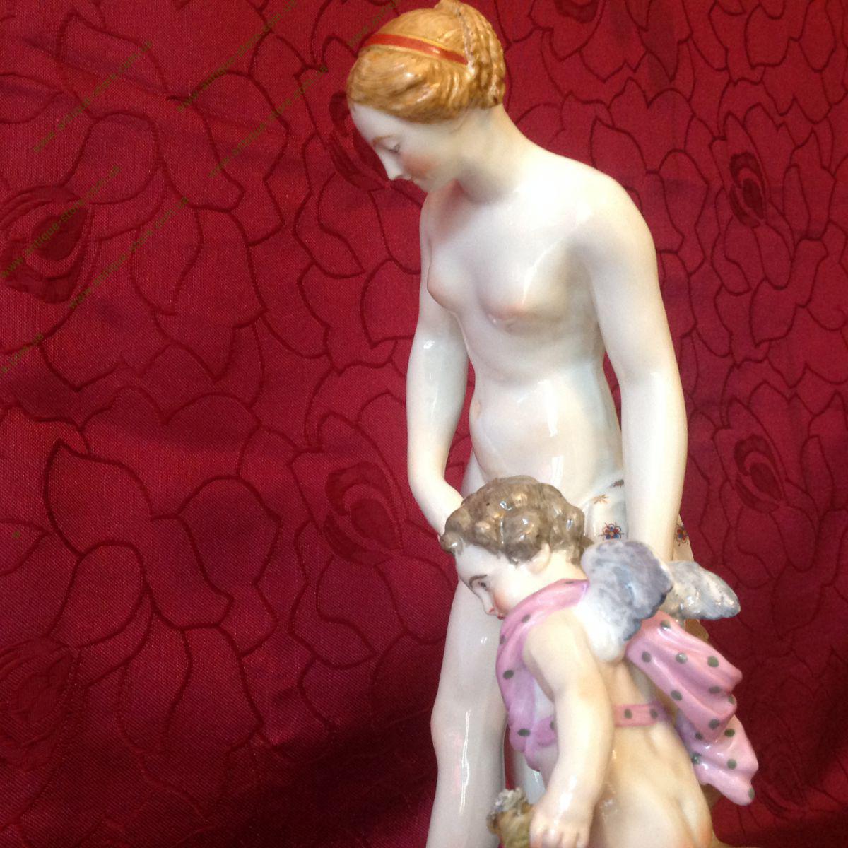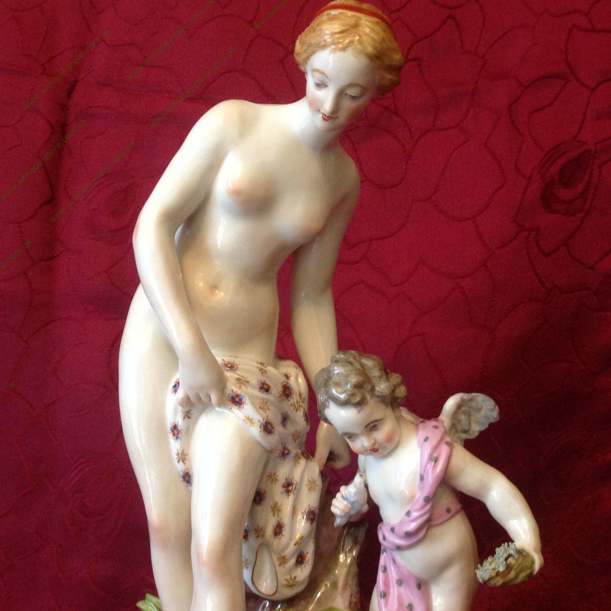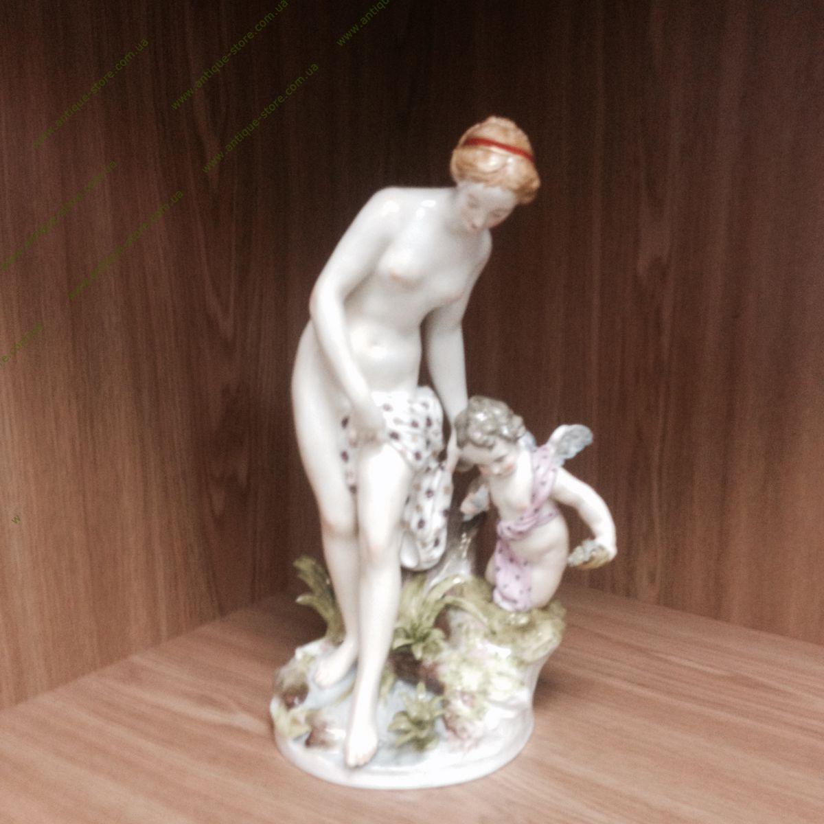 Фарфоровая фигура 19 века, полихромная роспись, лепка. Марка: синим подглазурно клеймо: перекрещенные S , в тесте S=, номер 15. Франция, севрский фарфор. Выполнено по модели Э.М.Фальконе (E.M.Falcone) , 1757 г. Скульптурная композиция включает в себя две фигуры: купающуюся Венеру и Амура. Многообразие элементов и изящество их исполнения характерны для лучших произведений севрского фарфора.