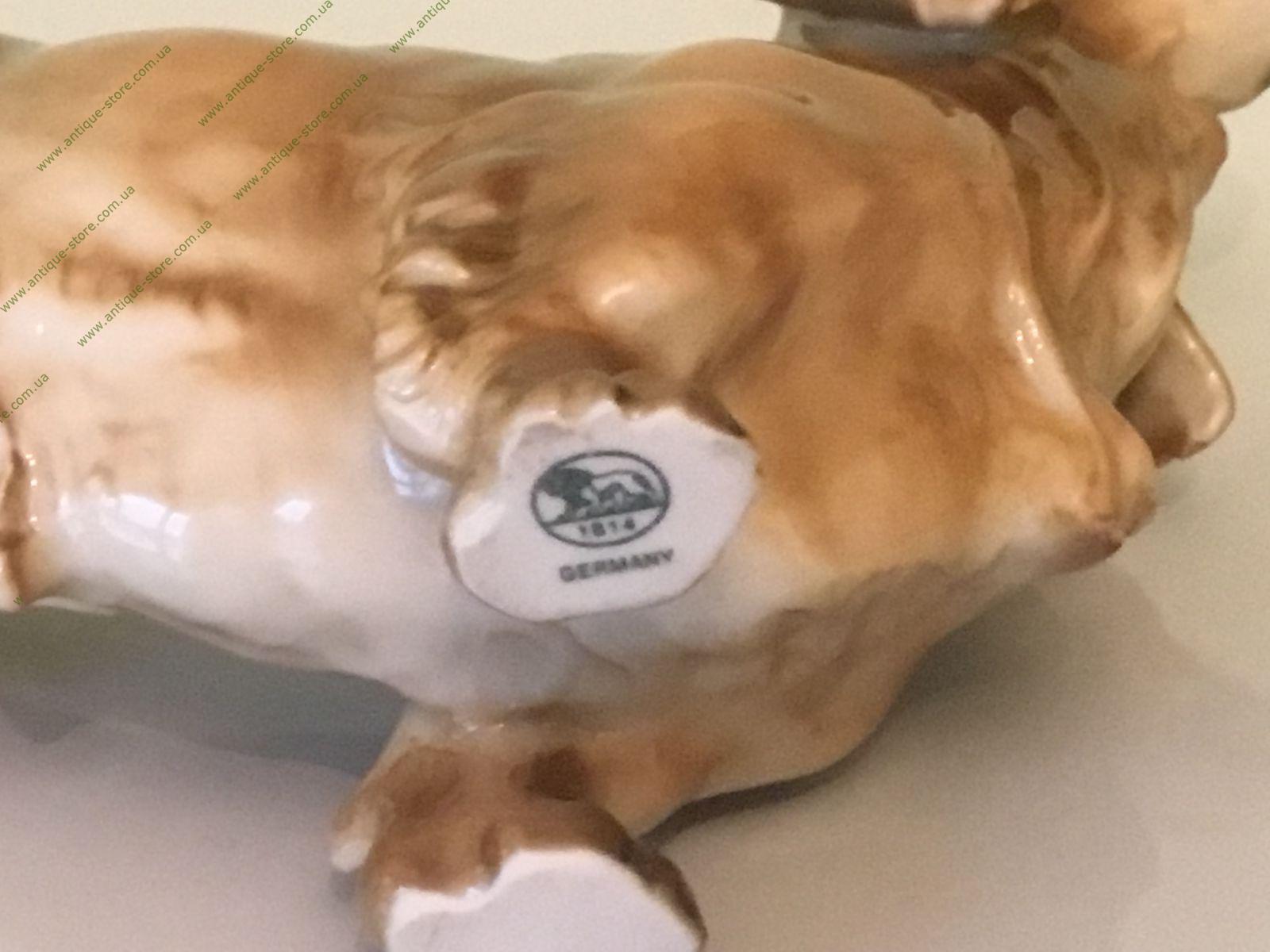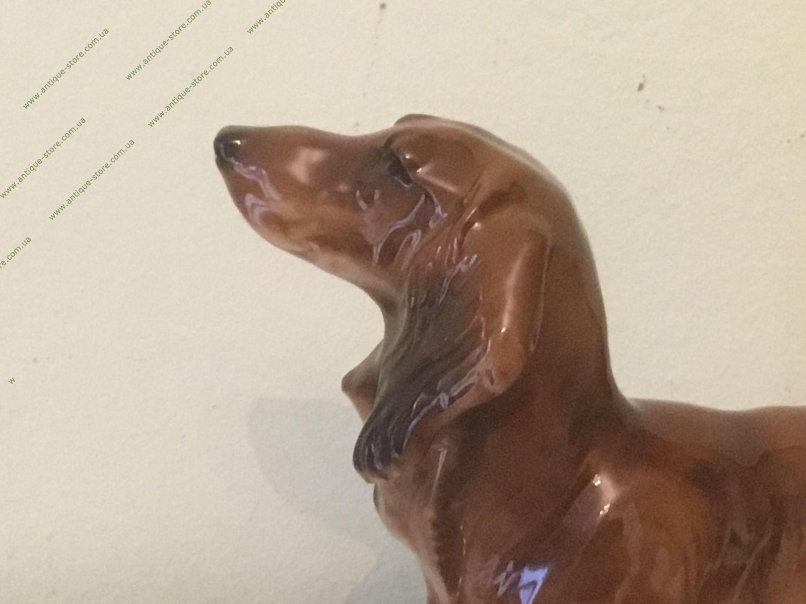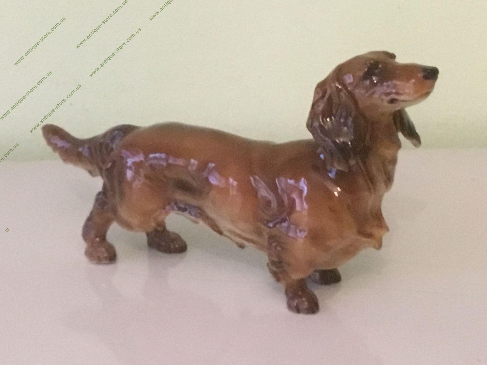 Фарфоровая фигурка, стоящей таксы с подглазурным клеймом мануфактуры Хутченройтер (Hutschenreuther) на обратной стороне.