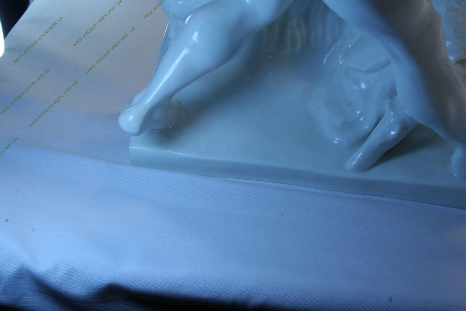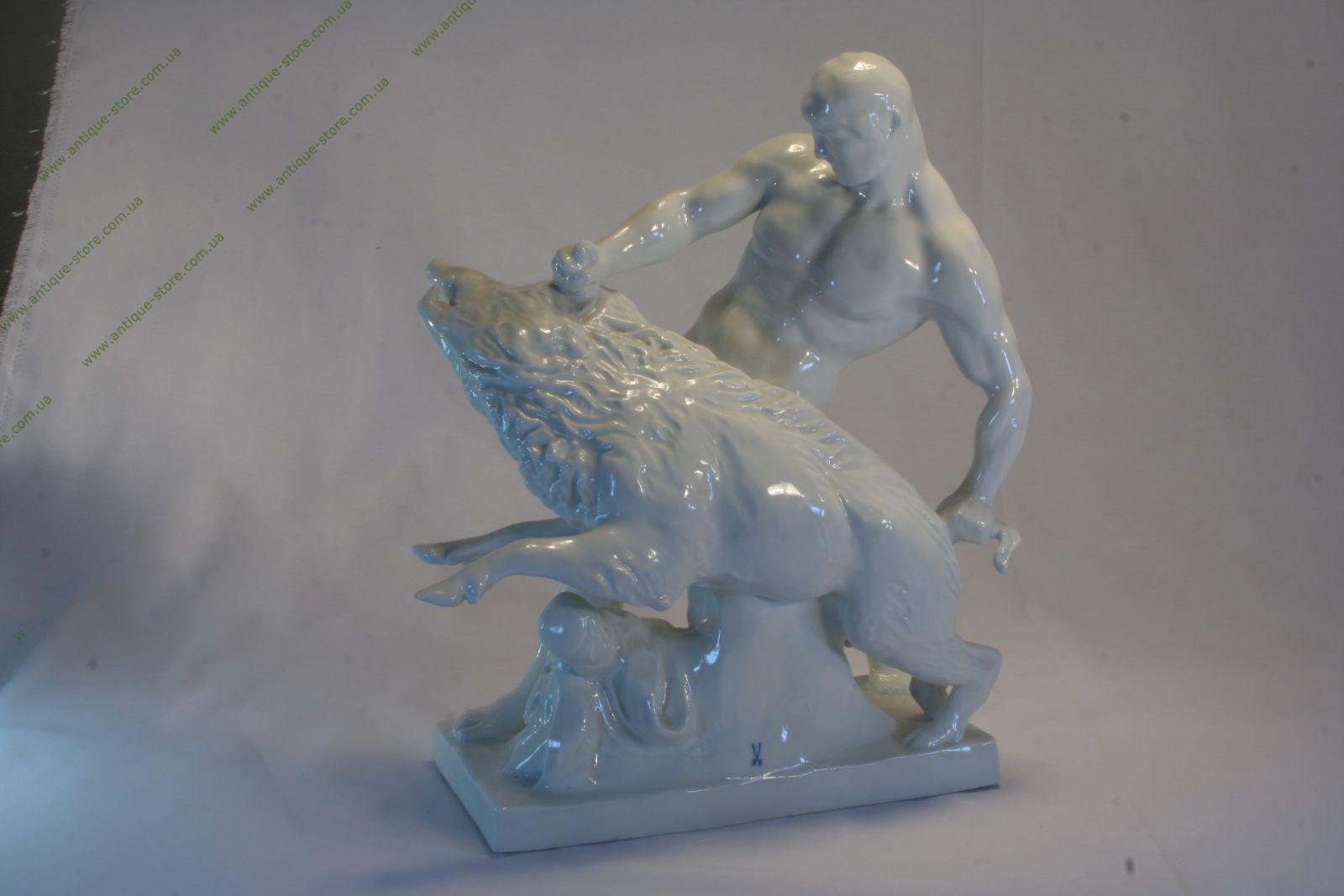 Великолепный мейсоновский фарфор. Редкая фигура, изображающая четвертый подвиг Геракла -"Бой Геркулеса с эримантским вепрем", работы известного скульптора Луиса Туллона (Louis Tuaillon), производства всемирно известной мануфактуры Мейсен (Meissen). Оригинал фигуры в бронзе, производства 1904 г. находится в берлинском зоопарке.