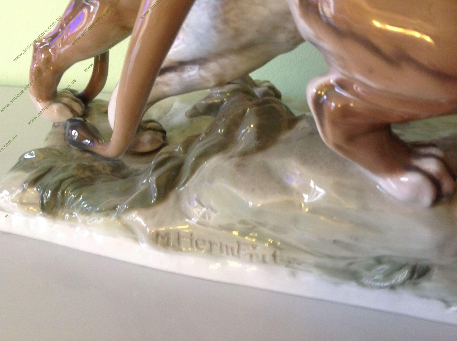 Очень редкая фигурка пары львов всемирно известной фабрики Rosenthal. Тончайшая превосходная поглазурная роспись. Клеймо 1944 года и надпись в тесте Hermann Fritz. Настоящая находка для коллекционера и чудесное украшение интерьера. Работа принадлежит известному художнику фабрики Розенталь Максу Херманну Фрицу, (Max Daniel Hermann Fritz).