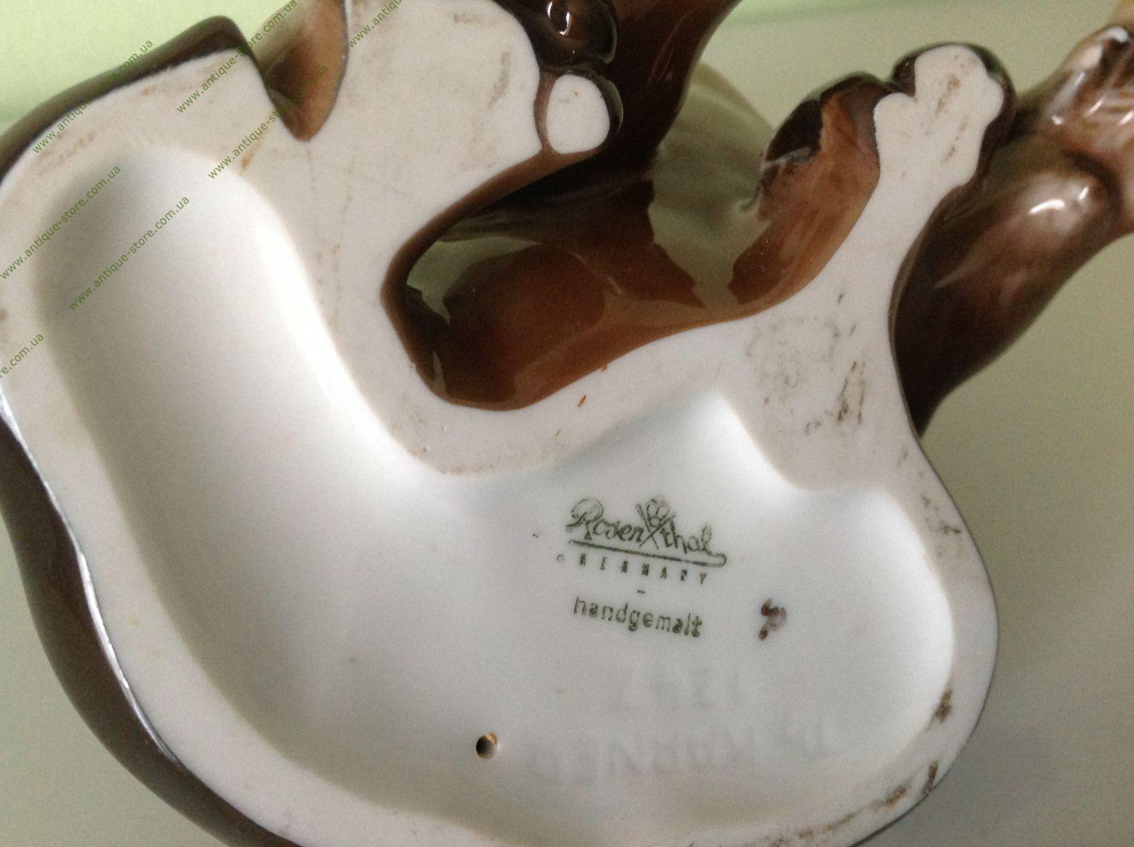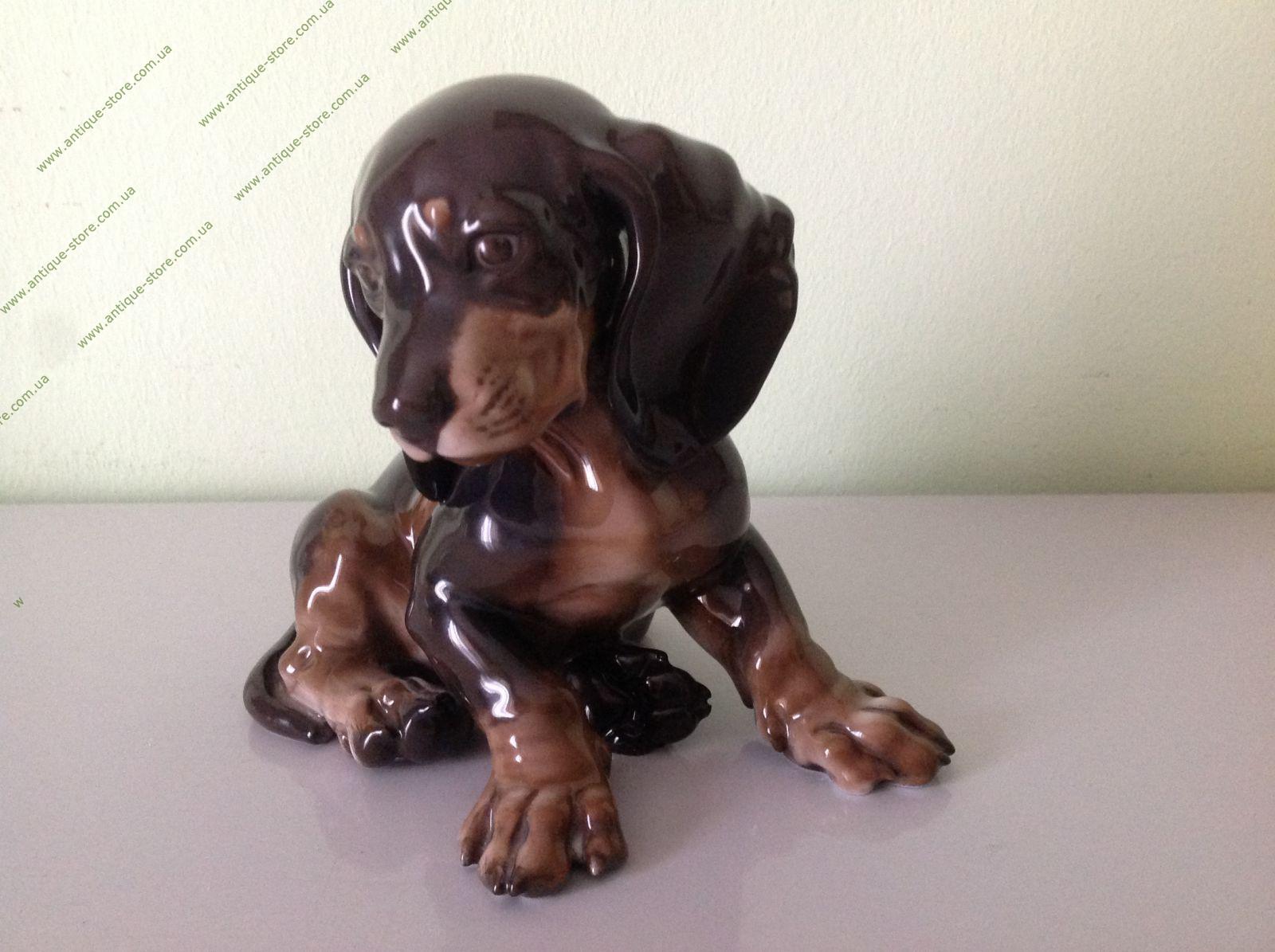 Фарфоровая фигурка сидящего щенка таксы. Арт. 1247. Собака темного цвета. Работа знаменитого художника фабрик Розенталь (Rosenthal) и Аллах (Allach), Теодора Кернера (Theodor Kaerner), (1884-1966). Снизу зеленое подглазурное клеймо «Rosenthal handgemalt».