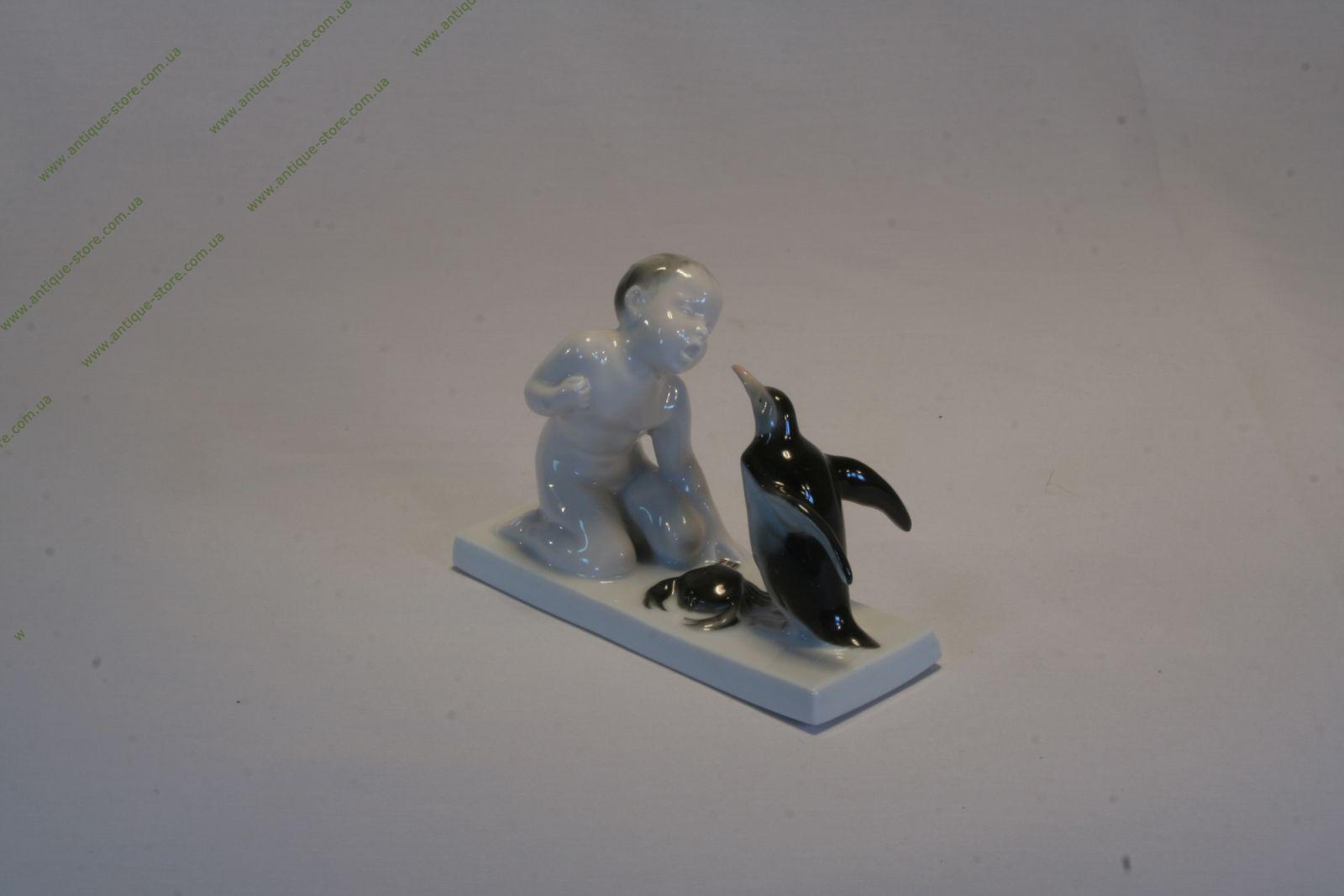 Великолепный розенталевский фарфор. Мальчик на коленях с пингвином и крабом. Работа знаменитого художника фабрики Розенталь, Фердинанда Либермана (1883-1941).