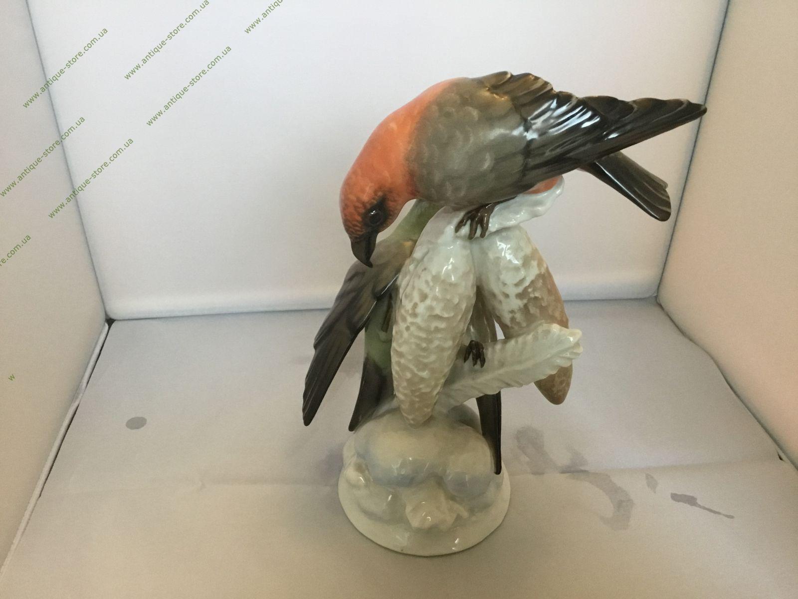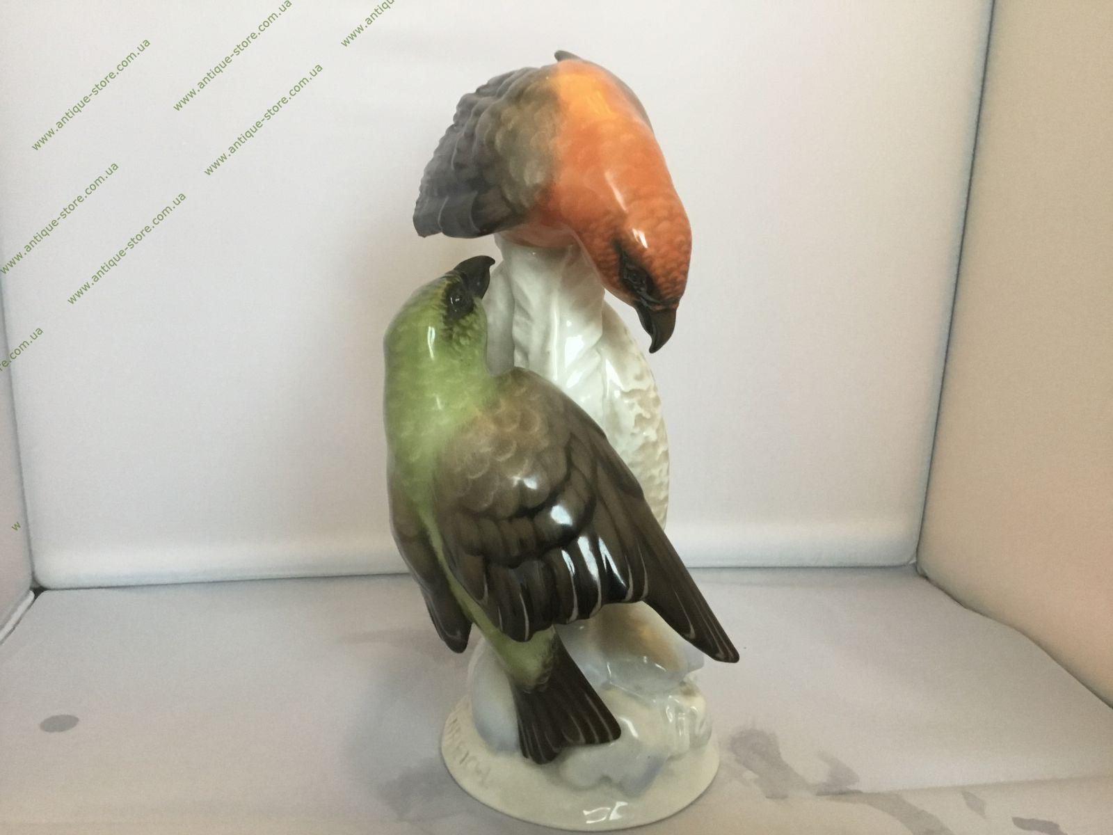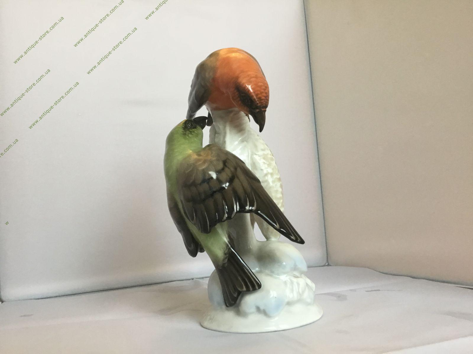 Фарфоровая фигурка двух клестов. Статуэтка цветного фарфора. Работа знаменитого художника фабрики Розенталь (Rosenthal) Фрица Хайденрейха (Fritz Heidenreich). Снизу зеленое подглазурное клеймо «Rosenthal », надпись в тесте: F. Heidenreich и Kreuzschnabel (Клест)