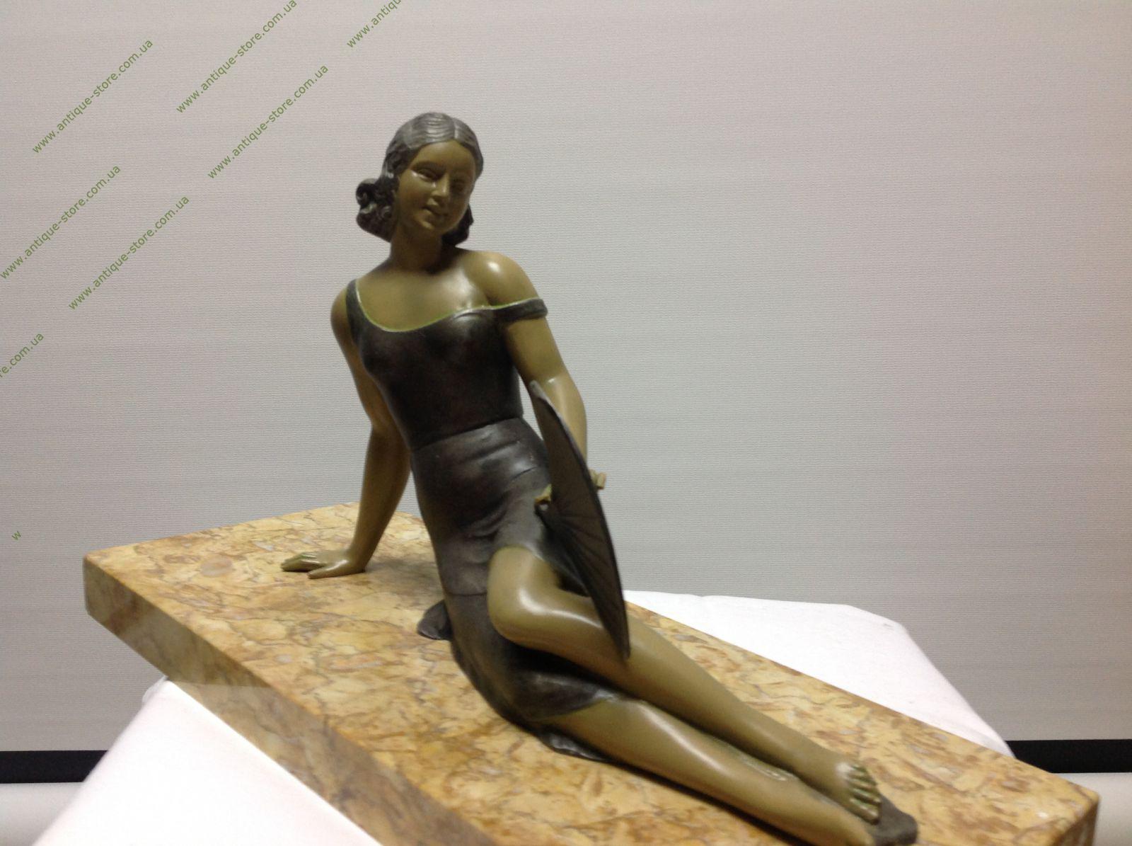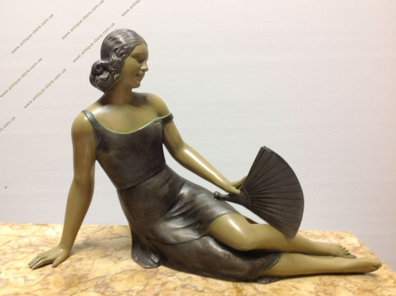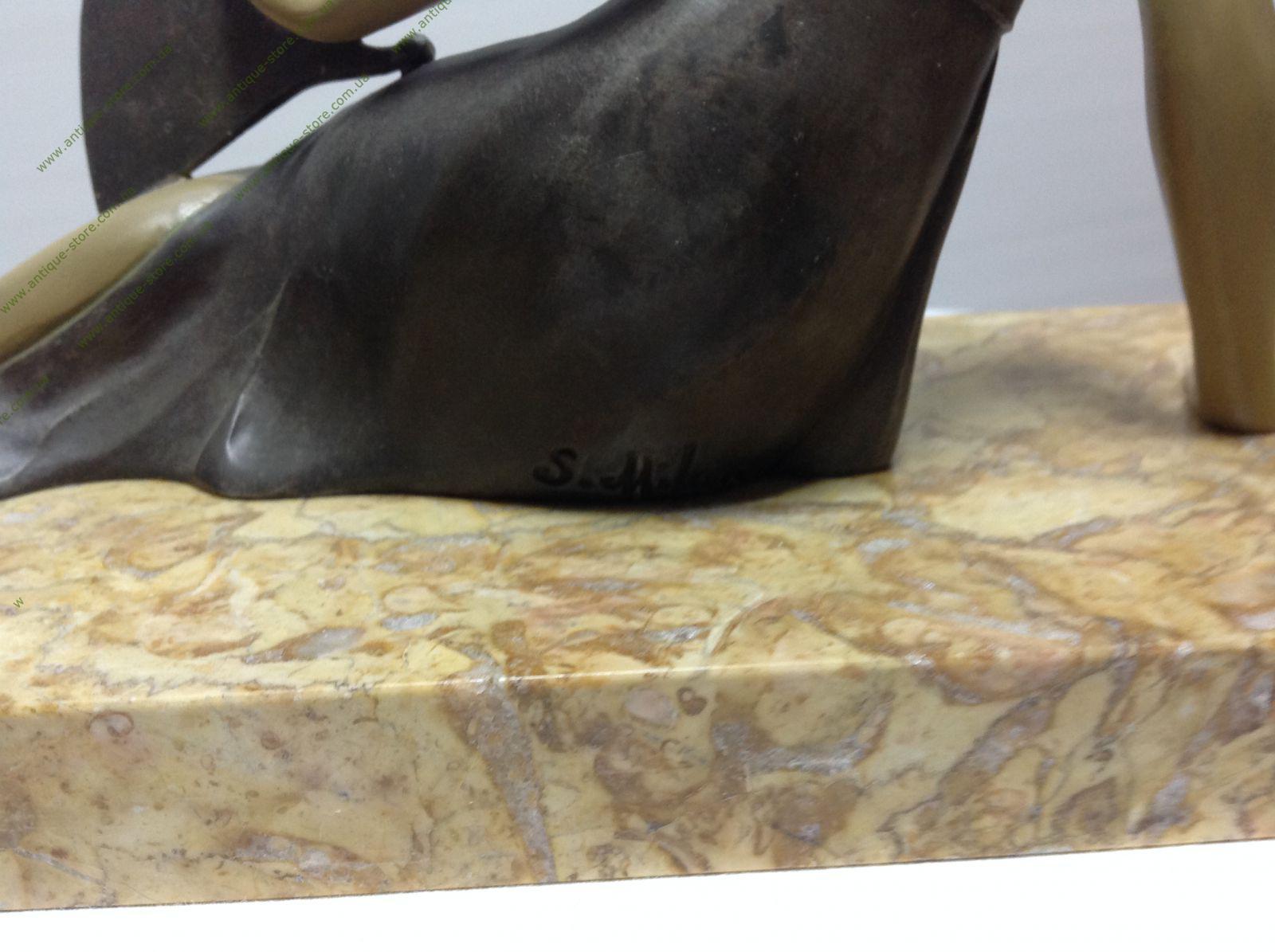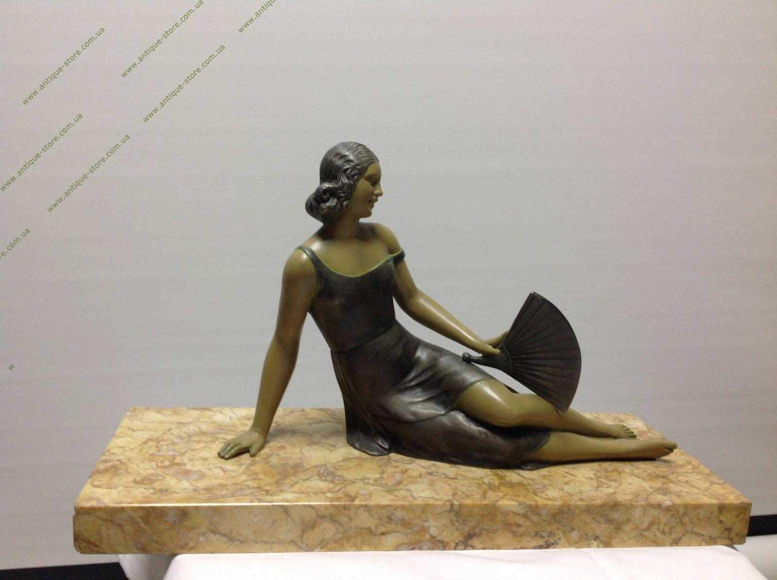Фигура сидящей девушки с веером из бронзы на мраморном постаменте. Фигура подписана S. Milat.