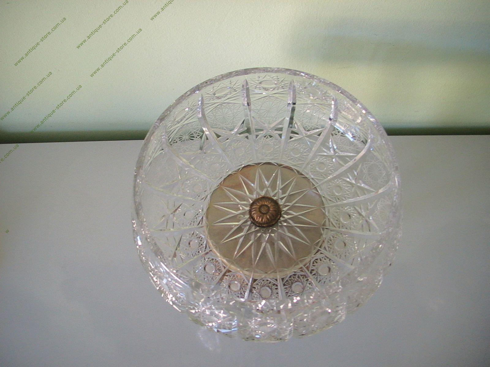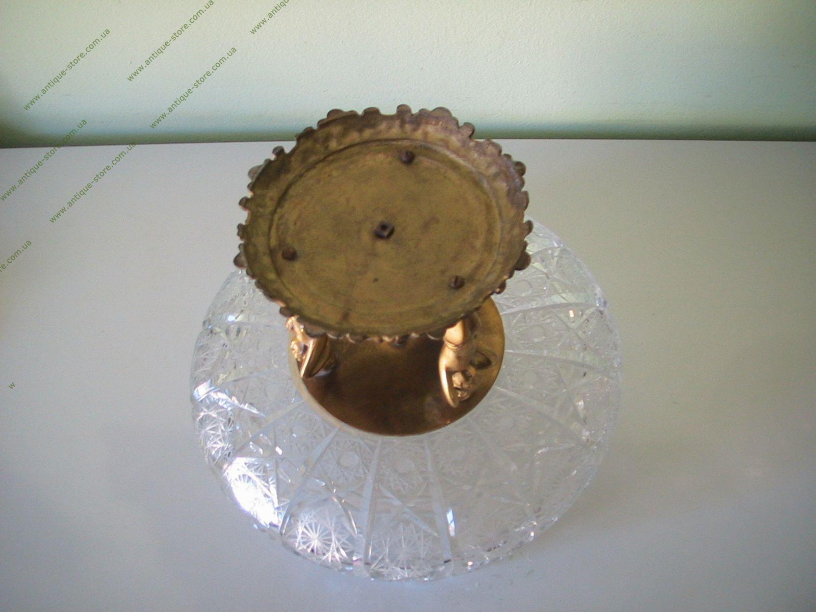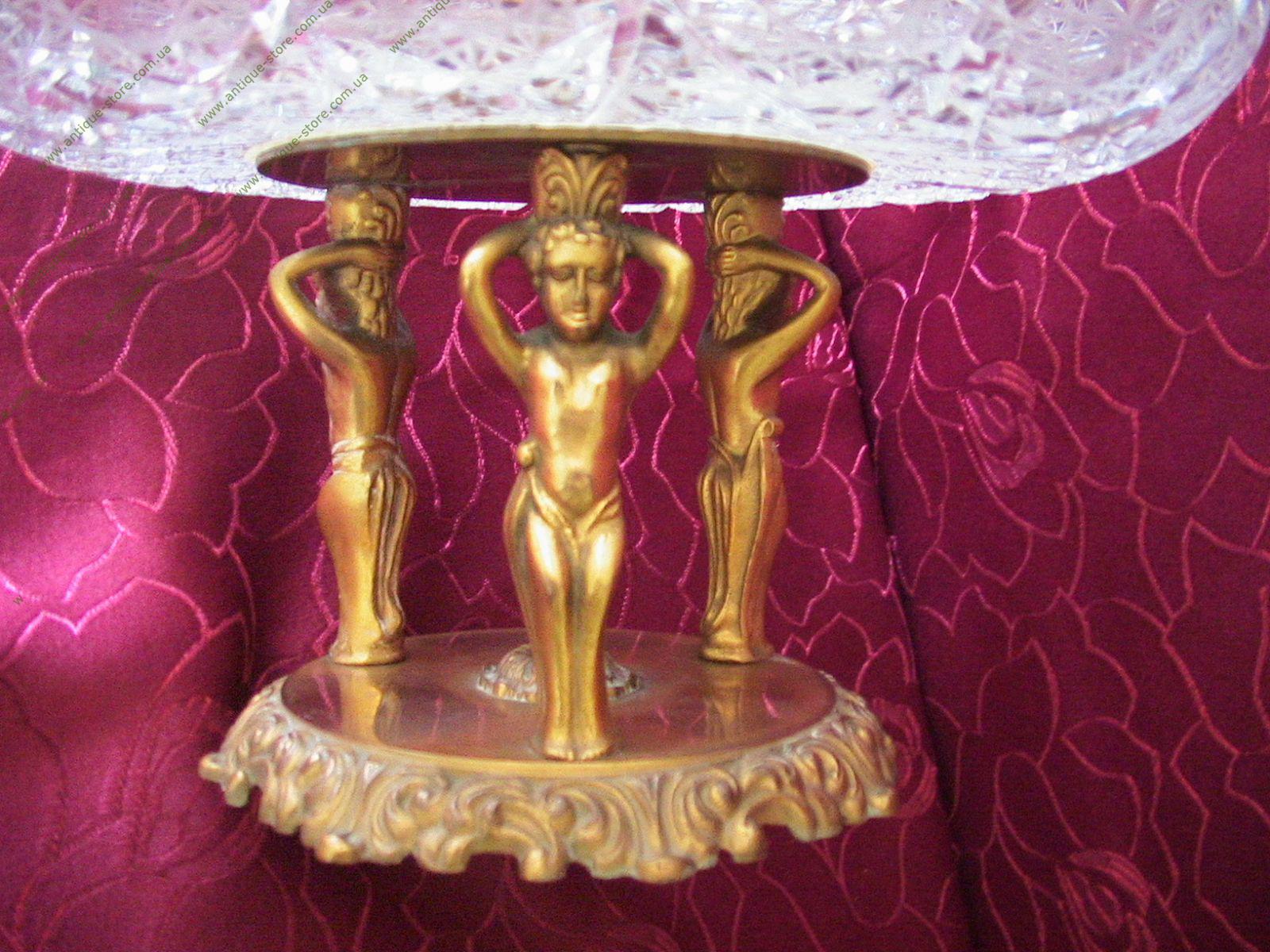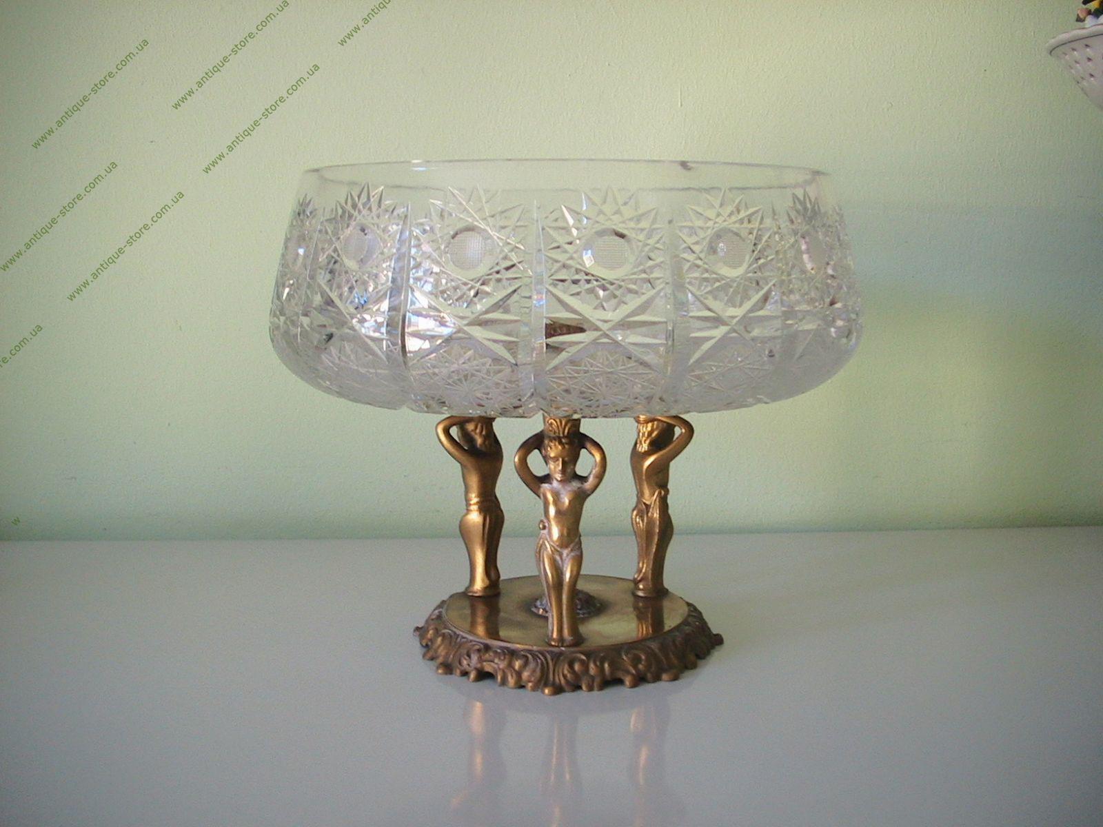 Антикварная декоративная ваза, или фруктовница. Верхняя часть изготовлена из хрусталя тонкой работы. Бронзовое основание создано в виде трех дев, поддерживающих чашу и украшено резьбой и растительными элементами. Сама ваза раскручивается на две части, чаша и подставка.