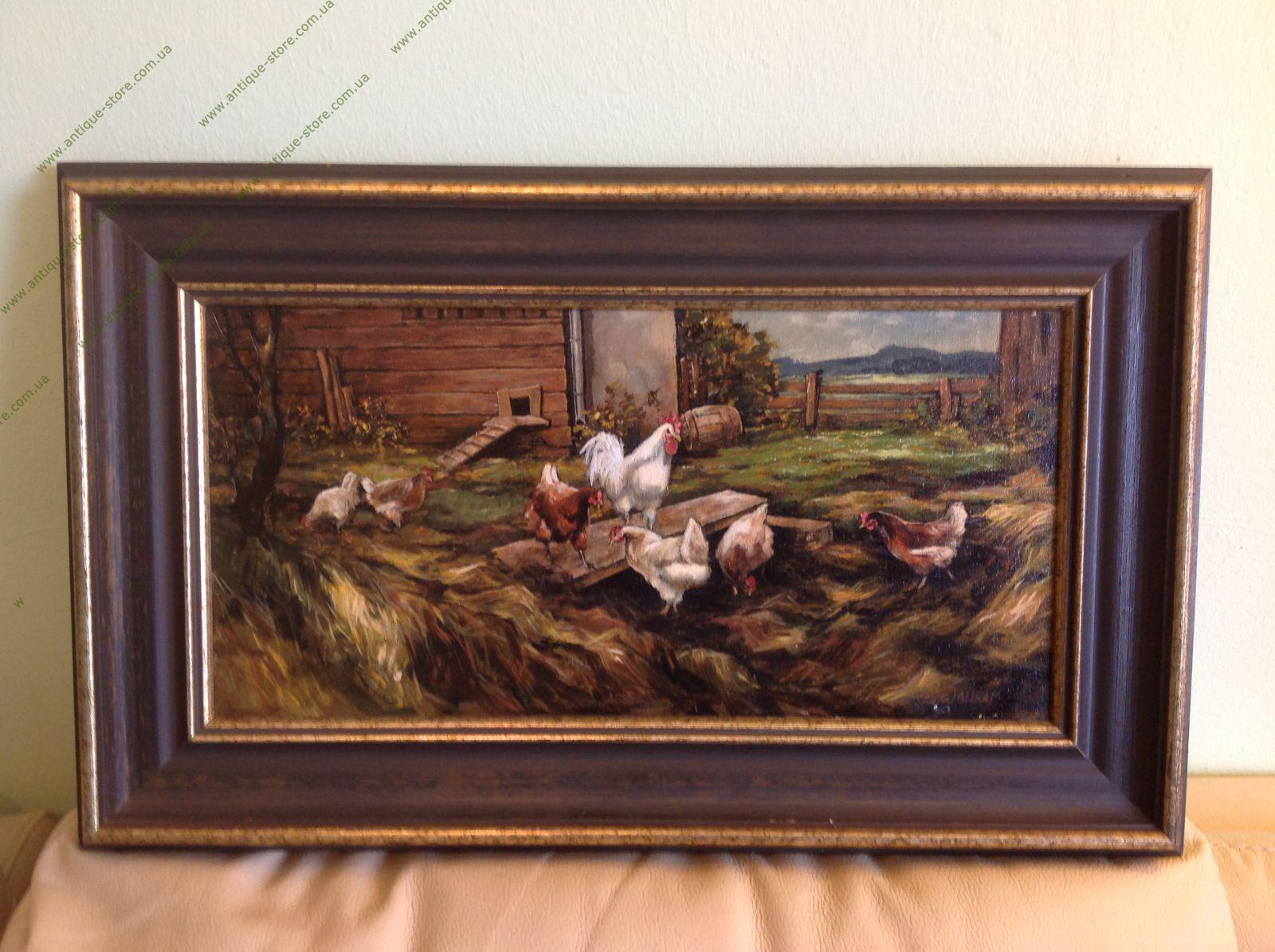 Жанровая сцена, изображающая птичий двор принадлежащая кисти немецкого художника Ф. Валирапа (F.Walirap). Размер с рамой 42 х 52 см.