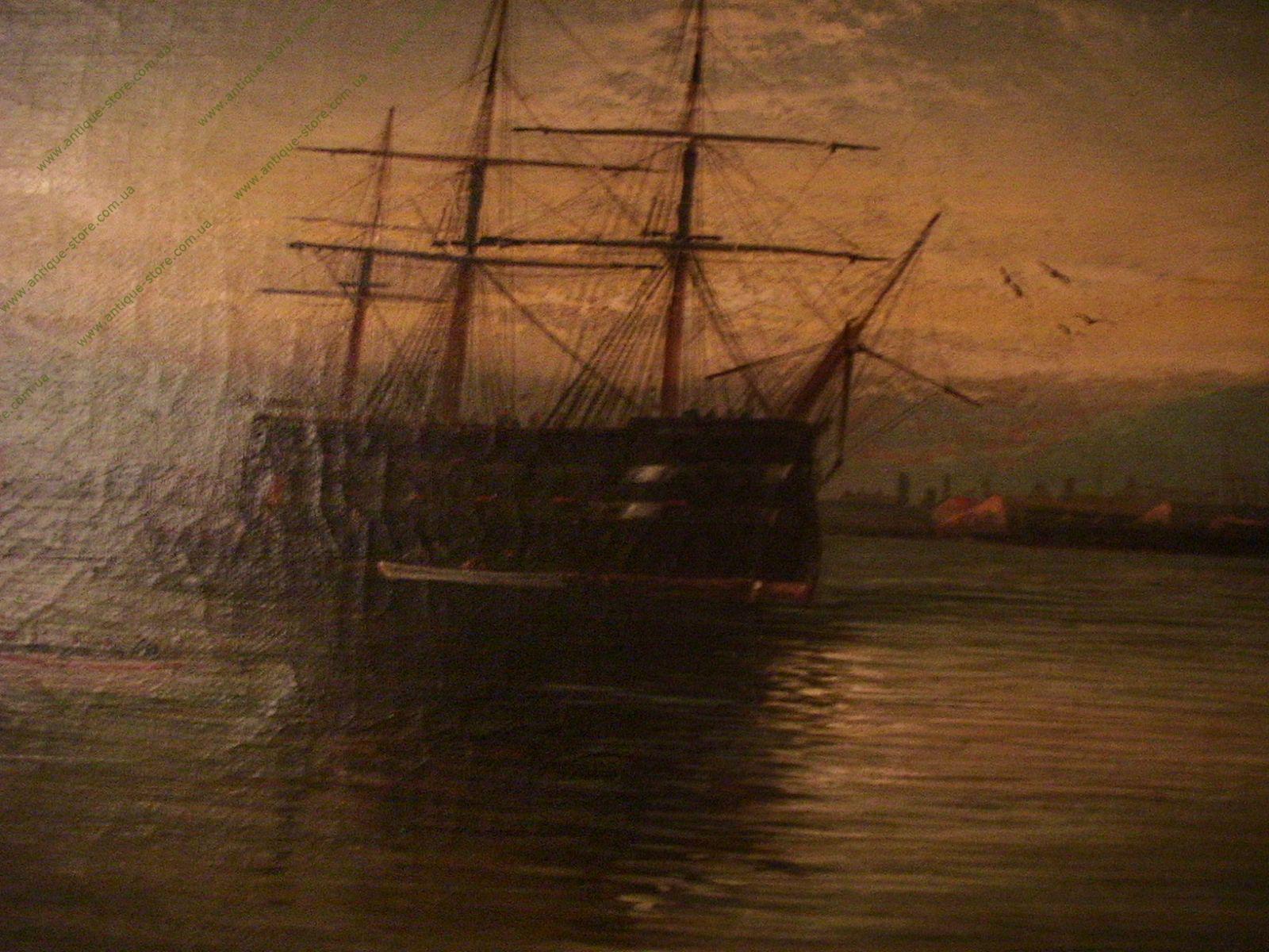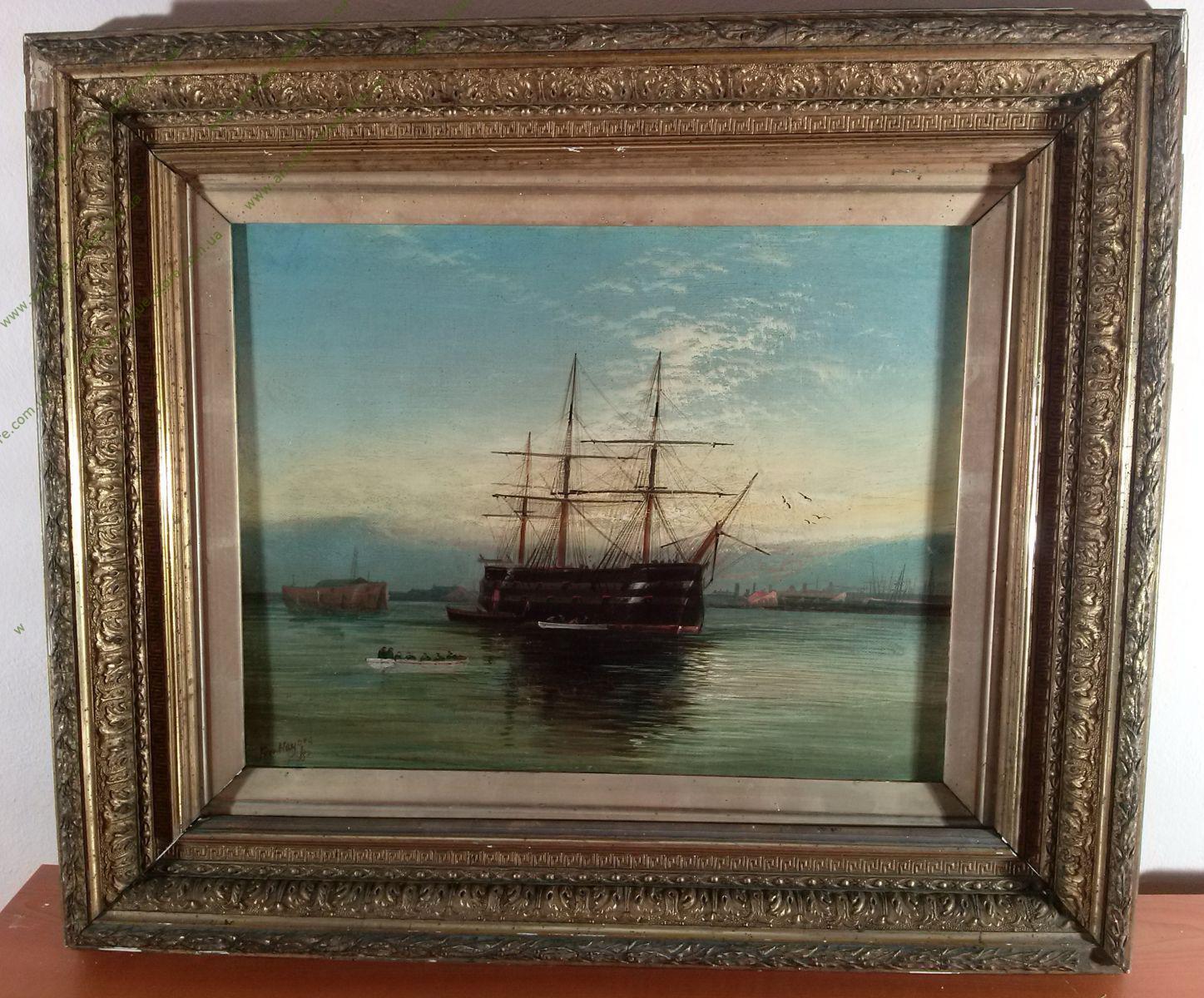 Морской пейзаж в стиле романтизма, изображающий парусный корабль в морской гавани, внизу слева подпись автора - Fred. Hay. предп. английский художник 19 века Фредерик Хайнес (Frederick Haynes), писавший морские пейзажи, полотна которого успешно продаются на аукционах Европы и Америки. Картина обрамлена в старинную раму выпущенную в мастерской Кембриджа.